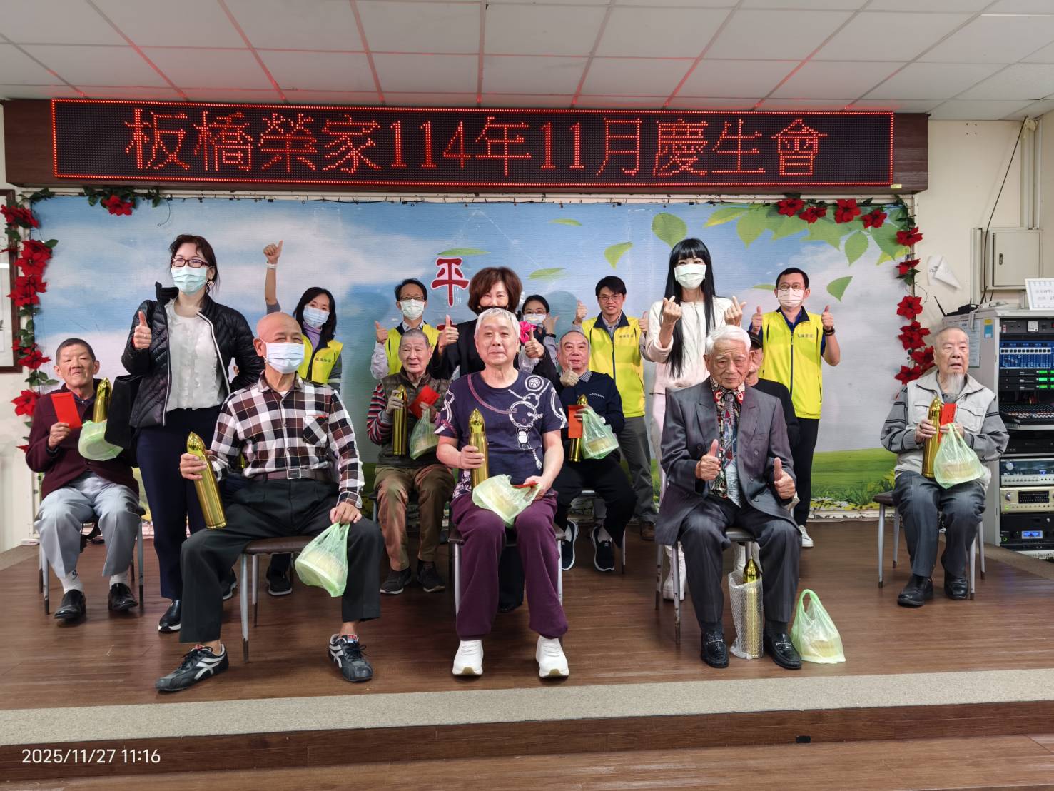 板橋榮譽國民之家於11月舉辦壽星慶生餐會,特邀萬事達開發行銷有限公司李奇璉董事及陸軍官校校友會羅理事長等貴賓蒞臨祝賀,現場氣氛熱鬧溫馨、賓主同歡。李奇璉董事特別捐贈子彈砲彈造型不鏽鋼保溫瓶,羅理事長亦代表校友會致贈一批慶生禮品,感謝榮家對長輩的細心照護,場面洋溢濃厚敬老情誼。