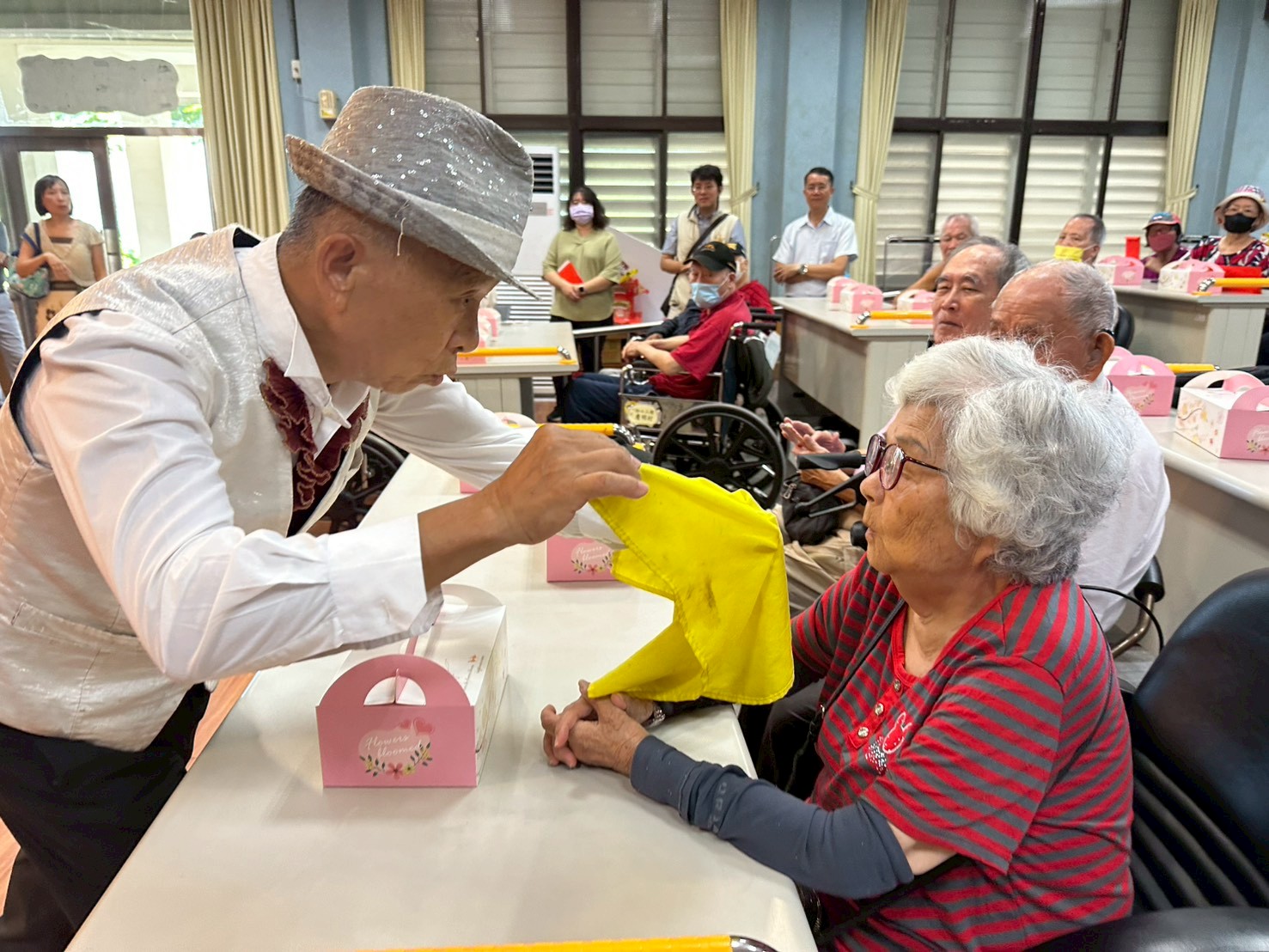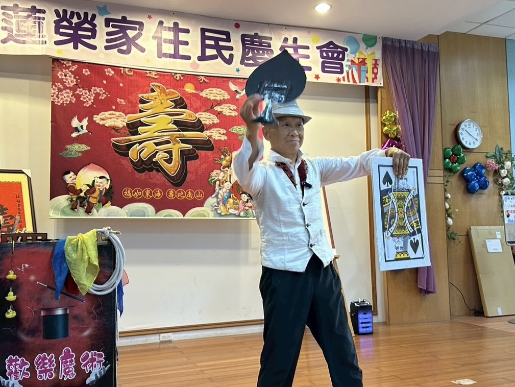 家主任代表總統及行政院長,致贈寫有「總統」和「行政院長」賀壽的匾額,以表達祝賀之意。黃伯伯也在眾人的祝福聲中,笑容滿面地祝福大家「都能健康快樂」,簡短卻真摯的話語,感動了在場的每一位長輩與同仁。 慶生會特別邀請知名魔術師陳敏樂帶來精采的魔術演出,變幻莫測的手法與幽默互動,讓住民們驚喜連連、笑聲不斷。