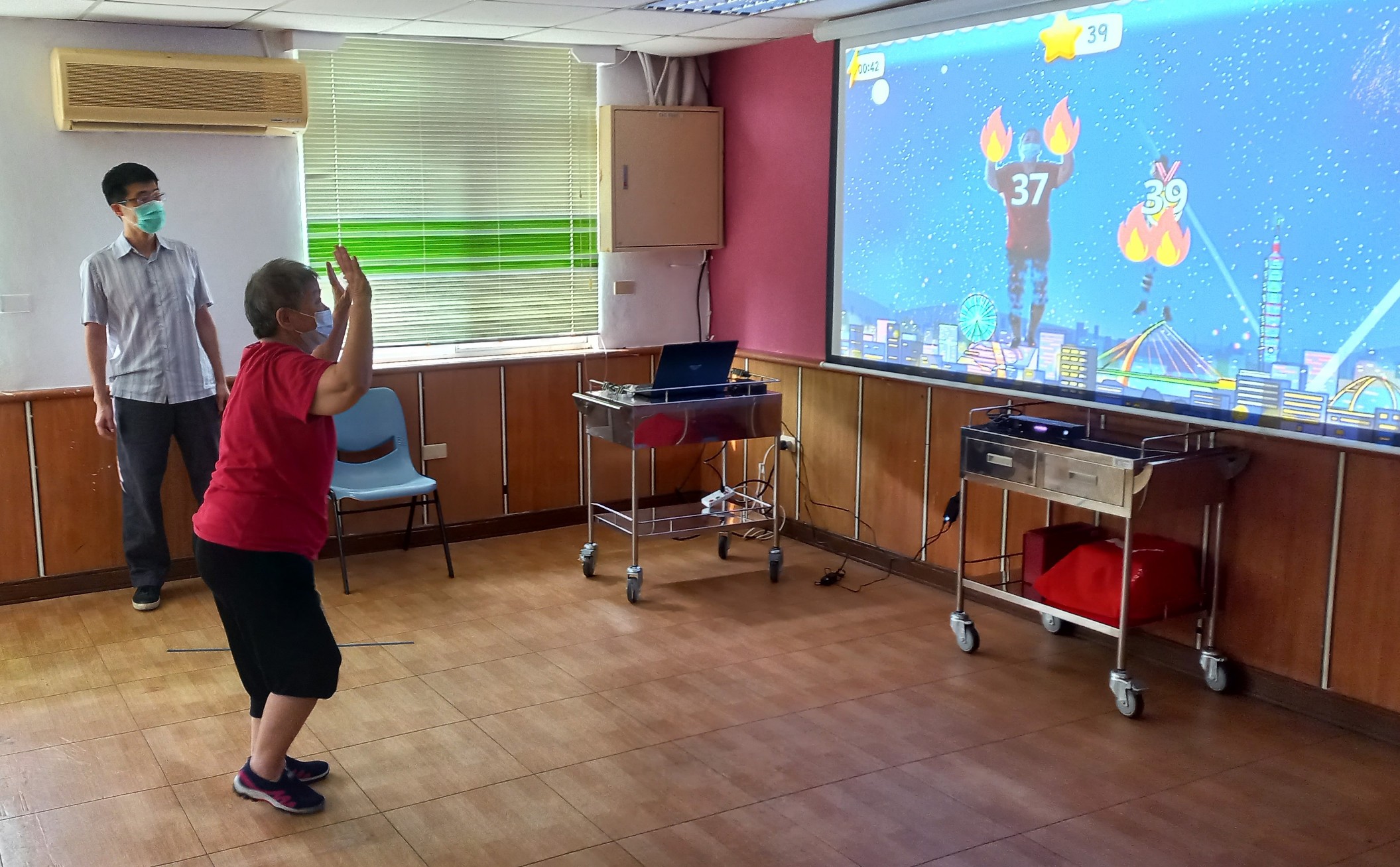 有鑑於榮家住民求診多有肢體僵硬無力、痠痛或心肺功能不足等問題,「HappyGoGo運動訓練系統」由馬蘭榮家醫務室復健專科藍光世醫師建議引入,經診斷後,身況合適的住民可在專業之物理治療師引導下,利用系統所設計之趣味化情境,模擬進行寵物美容、摘水果等動作,將復健動作融入遊戲之中,達成訓練之功效,還可記錄個人成果,讓住民為自我健康努力的同時,也獲得心理上之滿足與成就感。