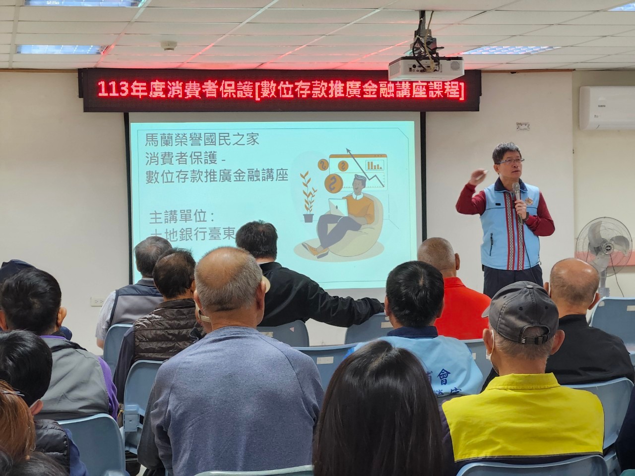 馬蘭榮譽國民之家與土地銀行臺東分行合作,於今(10)日辦理消費者保護-「數位存款推廣金融講座」,為榮家及臺東縣榮民服務處之職員工與住民長輩介紹多元理財管道,並提供優惠信貸等服務資訊,讓公教人員依自身財務需求靈活應用理財。 馬蘭榮家配合政府消費者保護政策舉辦講座,向職員工及住民宣導金融教育:隨著數位化時代的演進,除了日常消費方式習慣與管道改變,投資存款等金融服務也逐步走向線上;本次藉由土銀臺東分行之行員,將金融機構數位科技化所能帶來的便捷性與創新服務推廣給與課之人員;同時提醒數投資理財一定要找專業的理財專員,誤輕信網路及line上的投資群組。 馬蘭榮家對土地銀行人員撥冗授課表達感謝,也表示期待未來雙方能有更緊密之合作;讓政府單位與金融機構能一同合作推動相關金融政策與宣導消費者保護資訊,防堵詐騙,安心理財。 相關照片