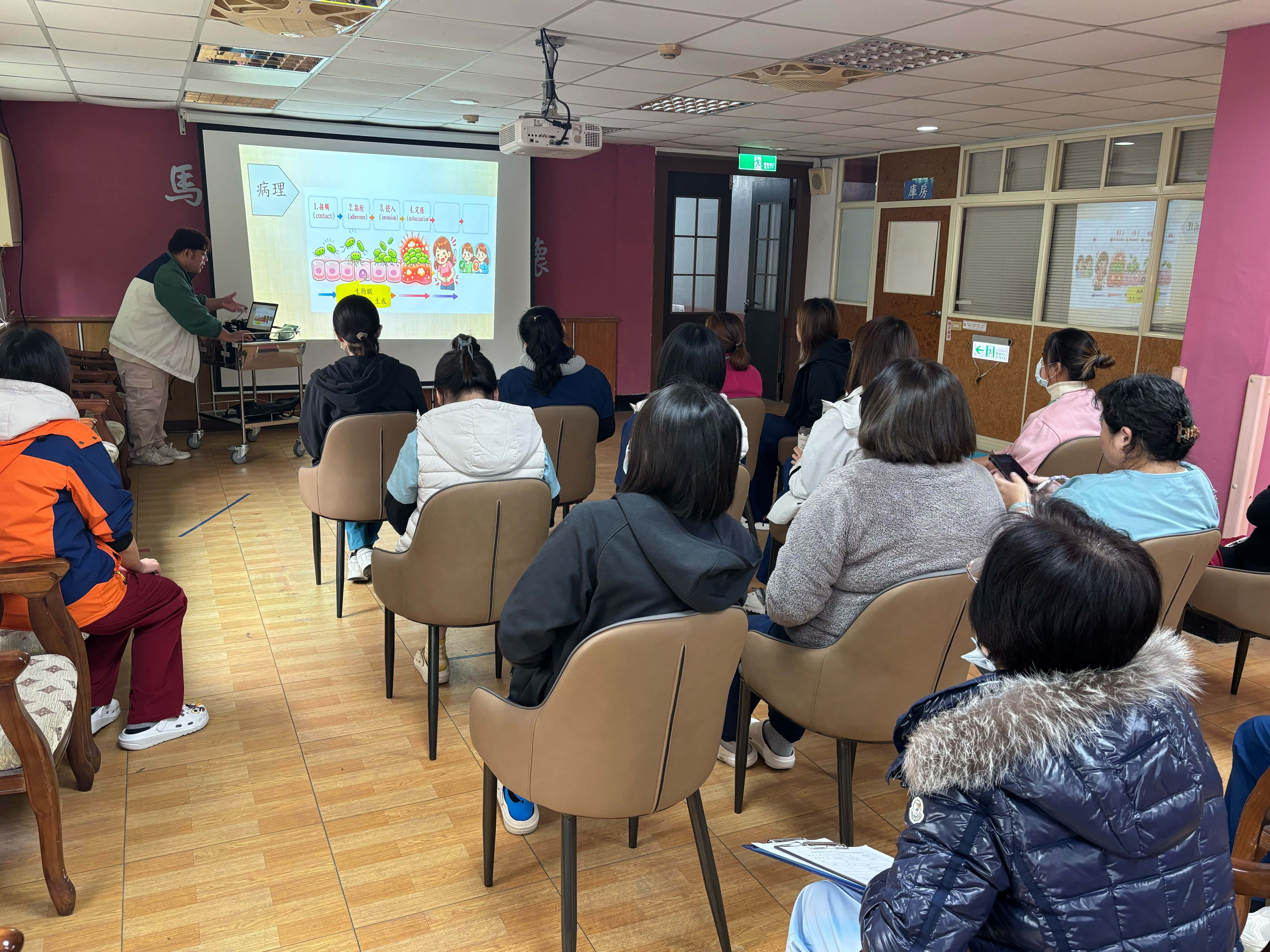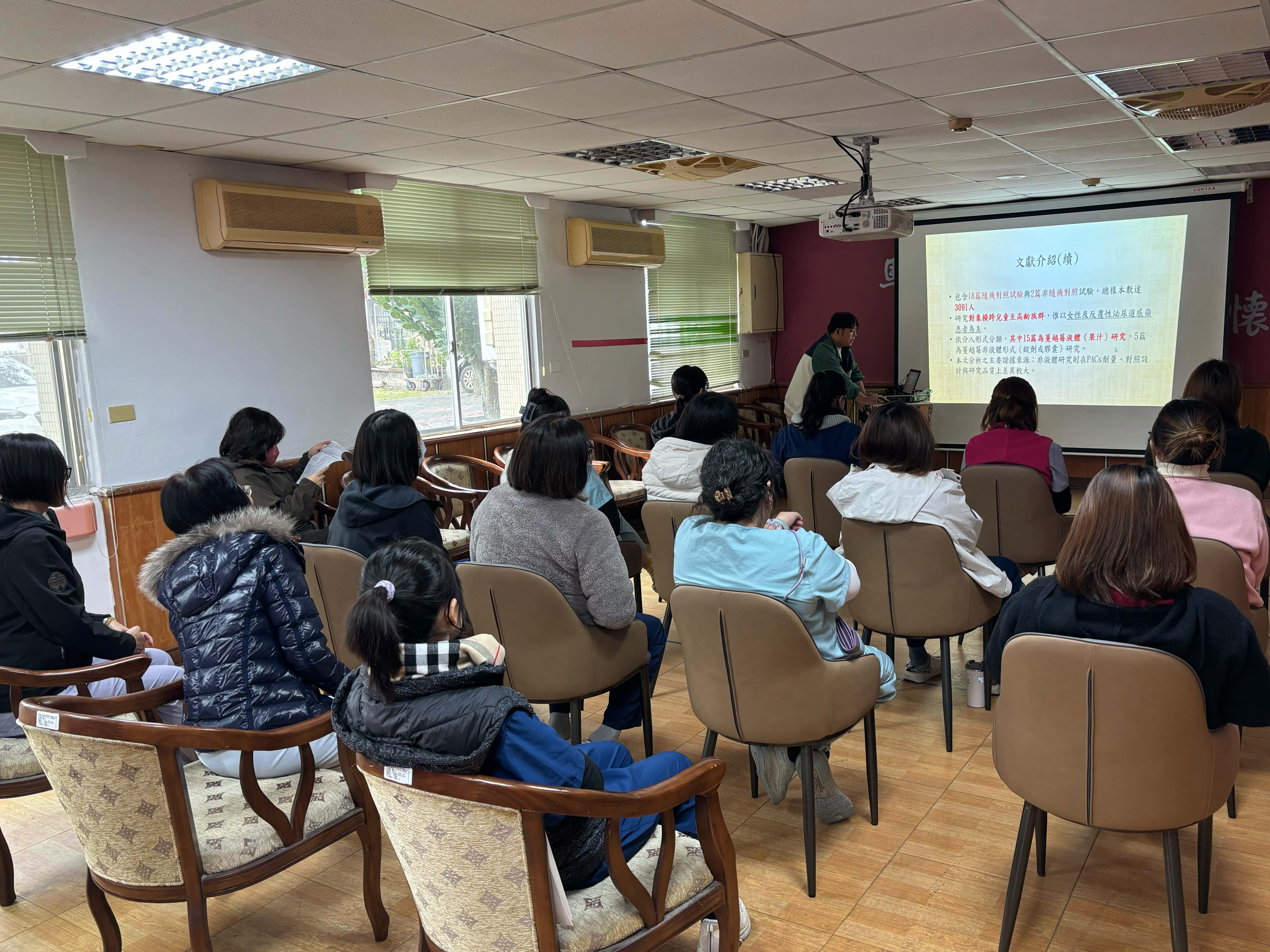為提升照護品質並推動實證護理,馬蘭榮家持續鼓勵護理人員精進專業知能。日前由保健組護理師余承勳,分享其於亞洲大學護理系碩士專班實習期間之研究成果,以「蔓越莓液體介入在泌尿道感染(Urinary Tract Infection, UTI)預防之實證」為主題,向本家護理同仁介紹相關文獻之統合分析與系統性回顧。 UTI是常見的細菌性疾病,關於蔓越莓產品在UTI預防的作用,科學數據目前仍有爭議。余護理師彙整國內外相關研究文獻,說明蔓越莓所含之活性成分(PACs),能降低女性UTI發生率,顯示蔓越莓液體介入在特定族群中具潛在預防效益,可作為非藥物性預防策略之一。余護理師也提醒,PACs攝取量與預防UTI之間存在顯著相關性,要達到具有臨床意義的UTI預防效果,需要達到蔓越莓液中PACs的最低每日攝取量水平,並考慮長時間使用後產生耐受性等因素,說明在實務應用時須考量個案健康狀況、用藥情形及整體照護計畫,作為輔助性健康促進措施。 馬蘭榮家表示,透過實證研究成果的交流與分享,有助於護理團隊掌握最新醫護趨勢,並將科學證據融入長者照護實務,未來也將持續推動專業知能分享,提供住民更安全、優質且全人化的照護服務。