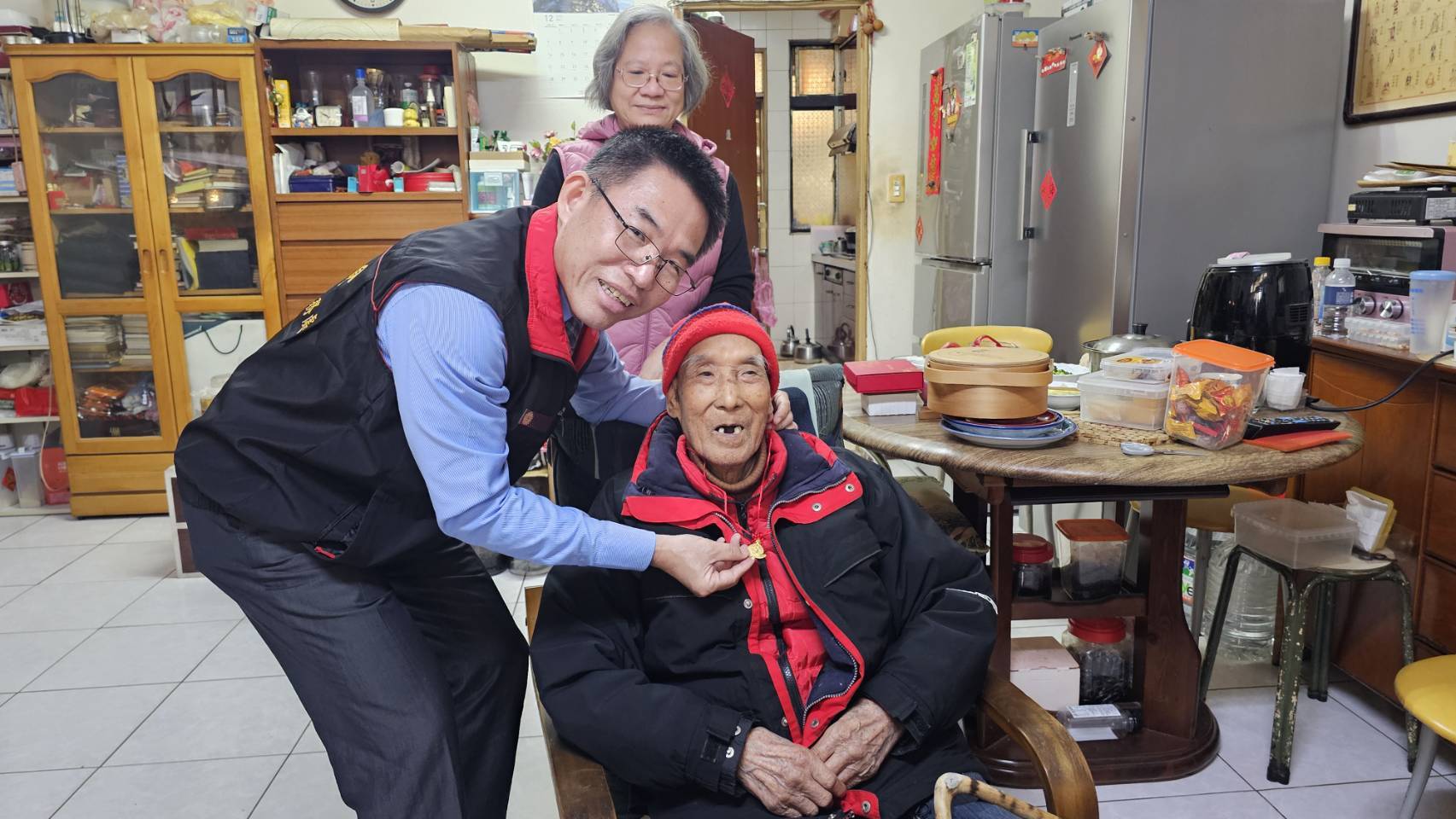 為祝賀榮民人瑞蔡爺爺迎接百歲壽辰,臺北市榮民服務處處長黃信仁今(15)日特代表退輔會主任委員嚴德發前往祝壽,致贈壽桃造型紀念金飾,並與輔導員、榮欣志工及替代役男齊唱〈生日快樂歌〉及〈黃埔祝壽歌〉,在家屬溫馨陪伴下,共同度過這難能可貴的百歲時刻,現場洋溢溫暖喜悅。 蔡爺爺民國15年出生於浙江省東陽縣,民國38年隨部隊來臺後於聯勤兵工廠退伍。退伍初期與友人合資從事五金零件製造,後至裕隆汽車投入維修與保養工作,始終以勤懇踏實的態度投入職涯。雖已高齡百歲,但仍精神矍鑠、笑容和煦,談吐清晰,充分展現良好生活習慣與樂觀心境。目前蔡爺爺與兒子及媳婦同住,三代同堂其樂融融。家人悉心照護,長輩健康穩定,家庭氛圍溫馨幸福。 爺爺平日最喜愛爬山健行,家中陽台至今仍擺放著他親手打造的手工登山杖,木質溫潤、工法細緻,展現他對山林的熱愛與生活品味。他生性樂觀豁達,常以微笑待人,亦樂於分享人生哲理。談及生活心得,總以平和口吻提醒後輩:「不與人爭,不羨慕別人,每個人都有自己的福。」簡單的一句話,蘊含著一生智慧,更展現長者溫厚善良的品格。 黃處長表示,未來榮服處將持續深化在地服務,整合政府與社福體系資源,主動關懷高齡、獨居或行動不便的榮民長輩,並透過安心御老平台、轉介長照及定期訪視等服務措施,確保長輩獲得更即時、更貼心且更有安全感的支持。