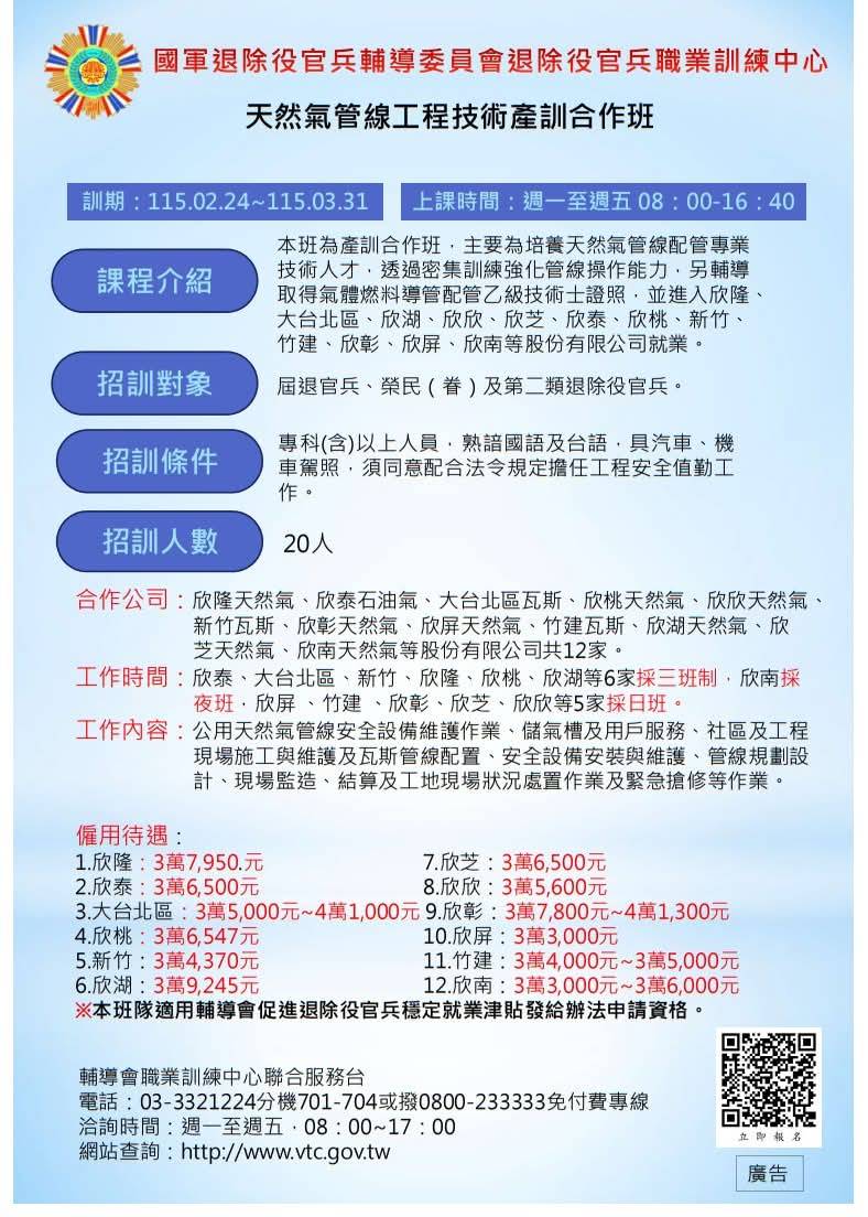 【報名班隊-(產訓專班)報名資訊】 115年上半年 天然氣管線工程技術班 (產訓合作) ++新增欣南公司++持續開放報名囉~ 😍😍 👉本班與欣隆、大台北區、欣湖、欣欣、欣芝、欣泰、欣桃、新竹、竹建、欣彰、欣屏、欣南等公司合作,有意參訓者須配合繳交履歷表及參加面試等程序,請於官網完成報名後 還要填寫履歷表 只要您符合身分是屆退官兵、榮民(眷)及二類官兵,歡迎踴躍報名。 🎯報名日期:即日起~115年1月18日。 上課地點:桃園市桃園區成功路三段78號 ★洽詢電話:新北市榮民服務處02-29530844分機167鄭小姐 報名網址: https://reurl.cc/A6KLYe 記得勾選 產訓合作班(委辦)-送出查詢