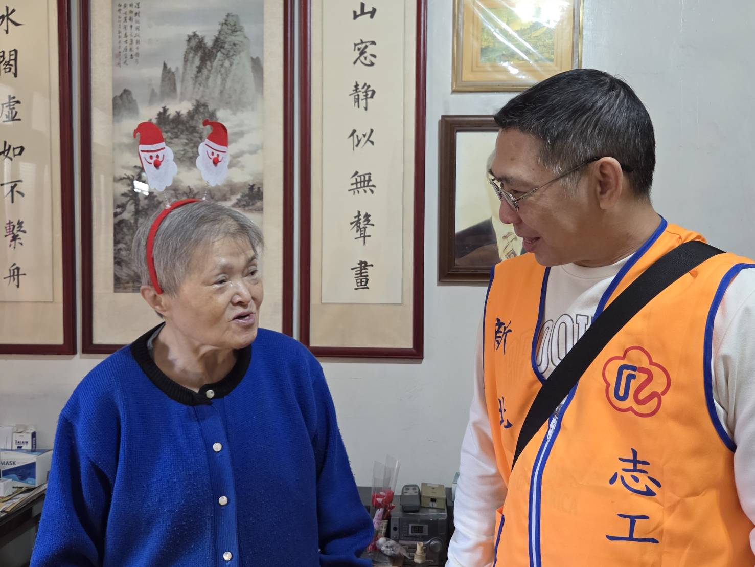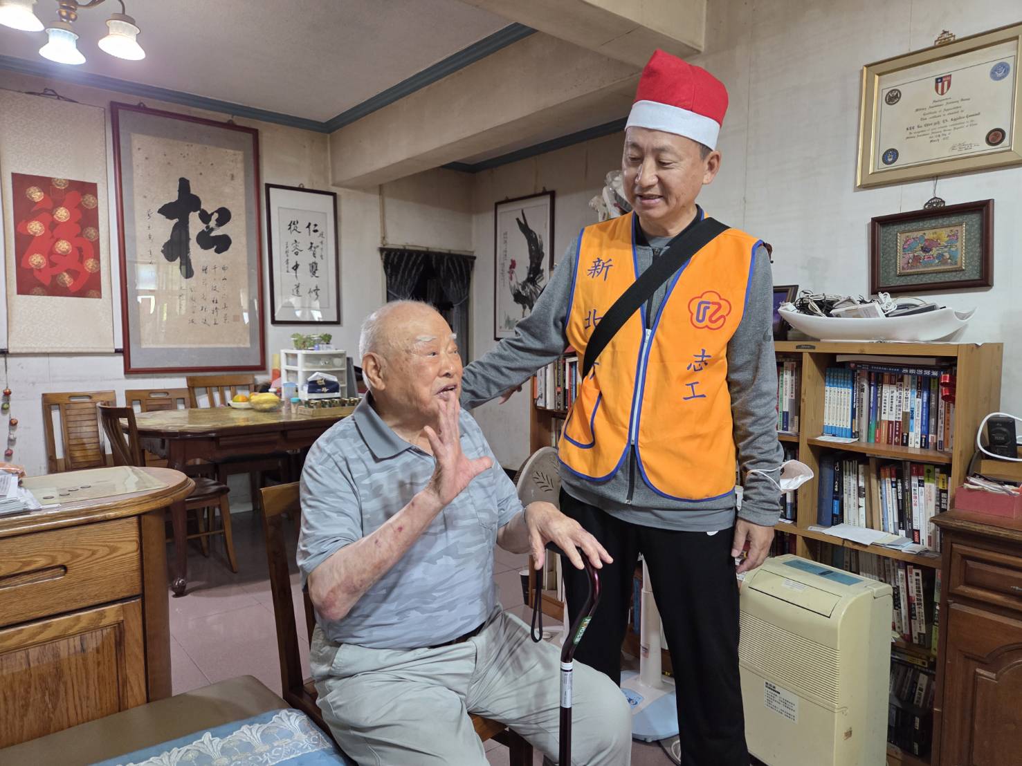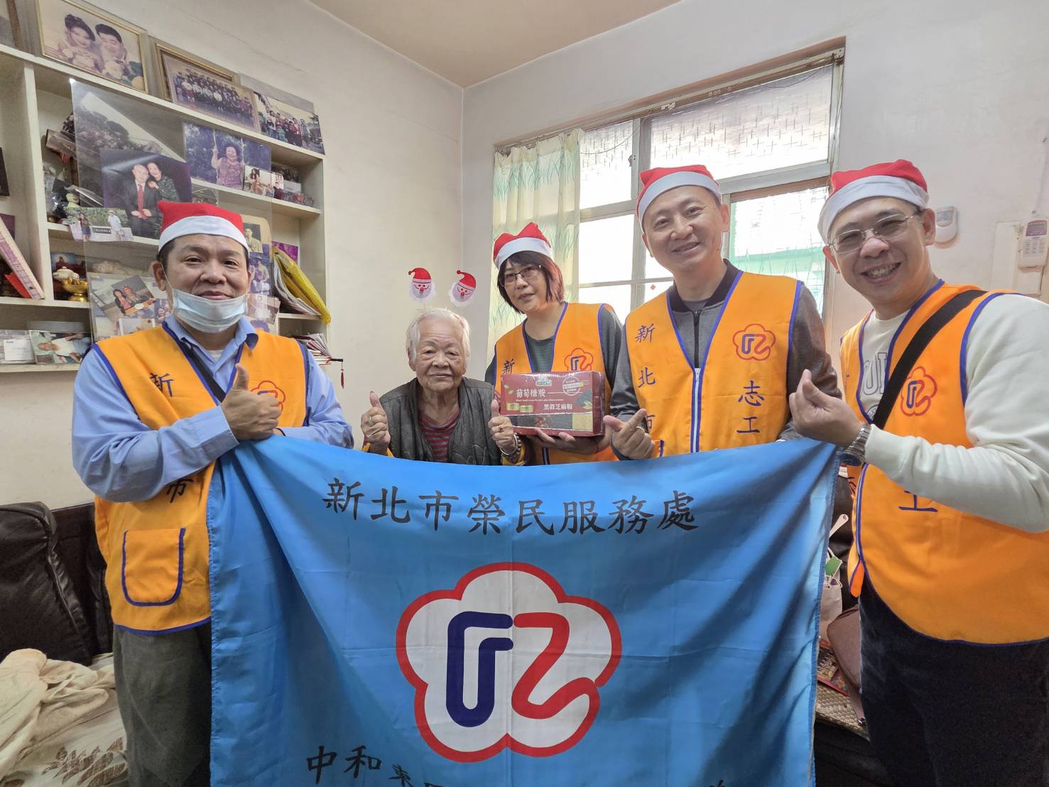 新北市榮服處榮欣志工隊,特別在聖誕佳節前夕,特別化身聖誕小精靈,頭戴聖誕帽,帶著聖誕小禮物逐一拜訪榮民眷。希望能在濃濃耶誕佳節裡,傳遞榮服處最誠摯的敬意與祝福。長輩們開門見到聖誕志工們手捧禮物傳遞佳音,開心地露出驚喜的笑容。95歲的葛伯伯很感性的說:這麼歡樂繽紛的祝福,是他收到過最棒的聖誕節禮物了!榮服處以實際行動聖誕傳愛,讓榮民眷們幸福滿載! 相關照片