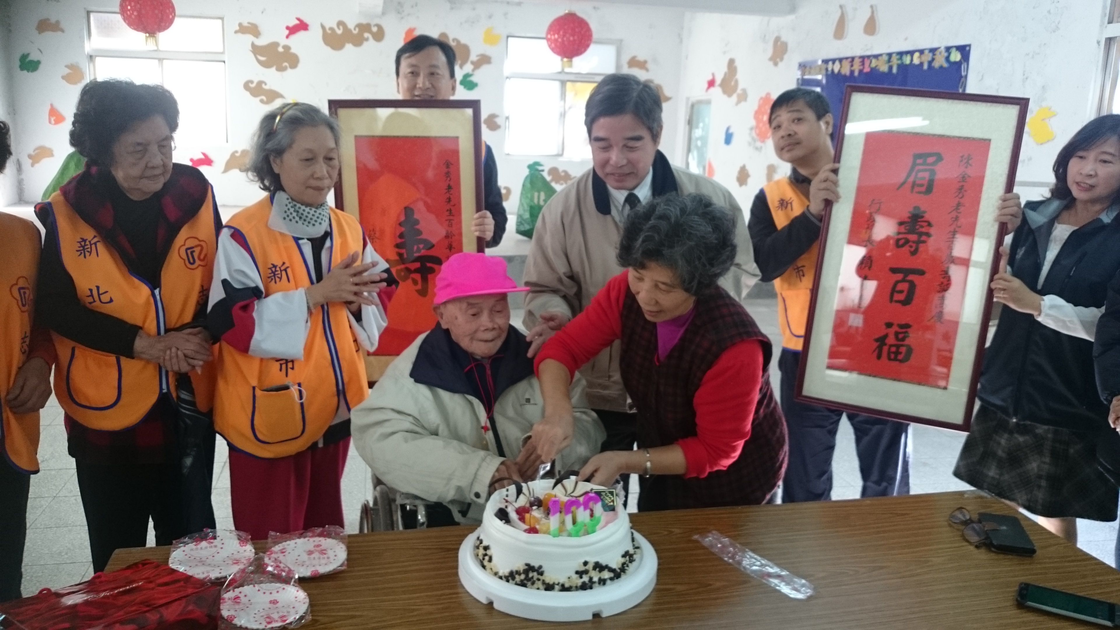 新北市榮民服務處林振生副處長於本(22)日率責任區輔導員、社區組長及榮欣志工等一行人,前往中和區與祥和山莊退員宿舍陳金秀爺爺歡度百歲壽誕,過程中除轉贈總統及行政院長賀歲壽屏,林副處長並代表輔導會主任委員致贈紀念金壽桃乙枚做為賀禮,祝賀陳爺爺生日快樂。 陳爺爺於民國7年出生於福建省浦田縣,目前夫妻同住共同照顧,爺爺以輪椅代步,身體狀況尚稱良好。慶生過程中參與盛會的夥伴們及該社區街坊鄰居友人大家為精神奕奕的陳爺爺唱生日快樂歌後,陳爺爺感動流下歡喜的眼淚。 今日又適逢一年一度的冬至,社區鄰居特別準備了熱騰騰的湯圓及水果,使得現場氣氛更加溫馨感人。夫妻兩人對此次大家前來祝壽之盛情表示感動,並感謝大家前來為其祝壽。