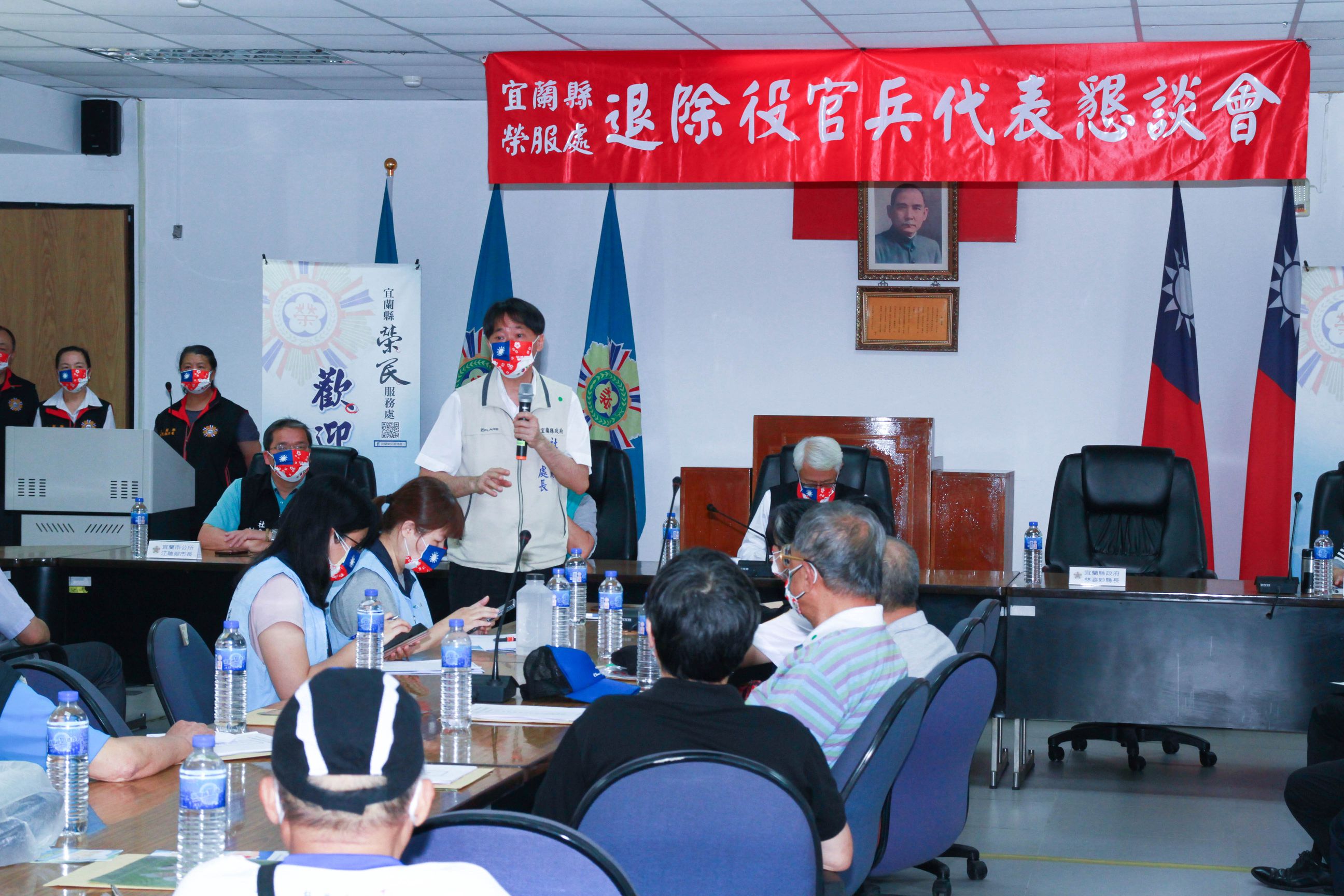 另本次懇談會邀請宜蘭縣政府社會處林蒼蔡處長、宜蘭縣後備指揮部徐貫彰中校、臺北榮總蘇澳分院社工室主任鄭世文等貴賓蒞臨參與懇談,此外宜蘭縣政府林姿妙縣長、宜蘭市公所、立委陳歐珀辦公室及宜蘭縣勞工處、衛生局長照管理所、移民署宜蘭服務站、森林保育處等單位暨宜蘭縣15個退伍軍人社團均指派代表出席與會,與現場退除役官兵等約100餘人,交換意見,逐一說明互動熱烈。