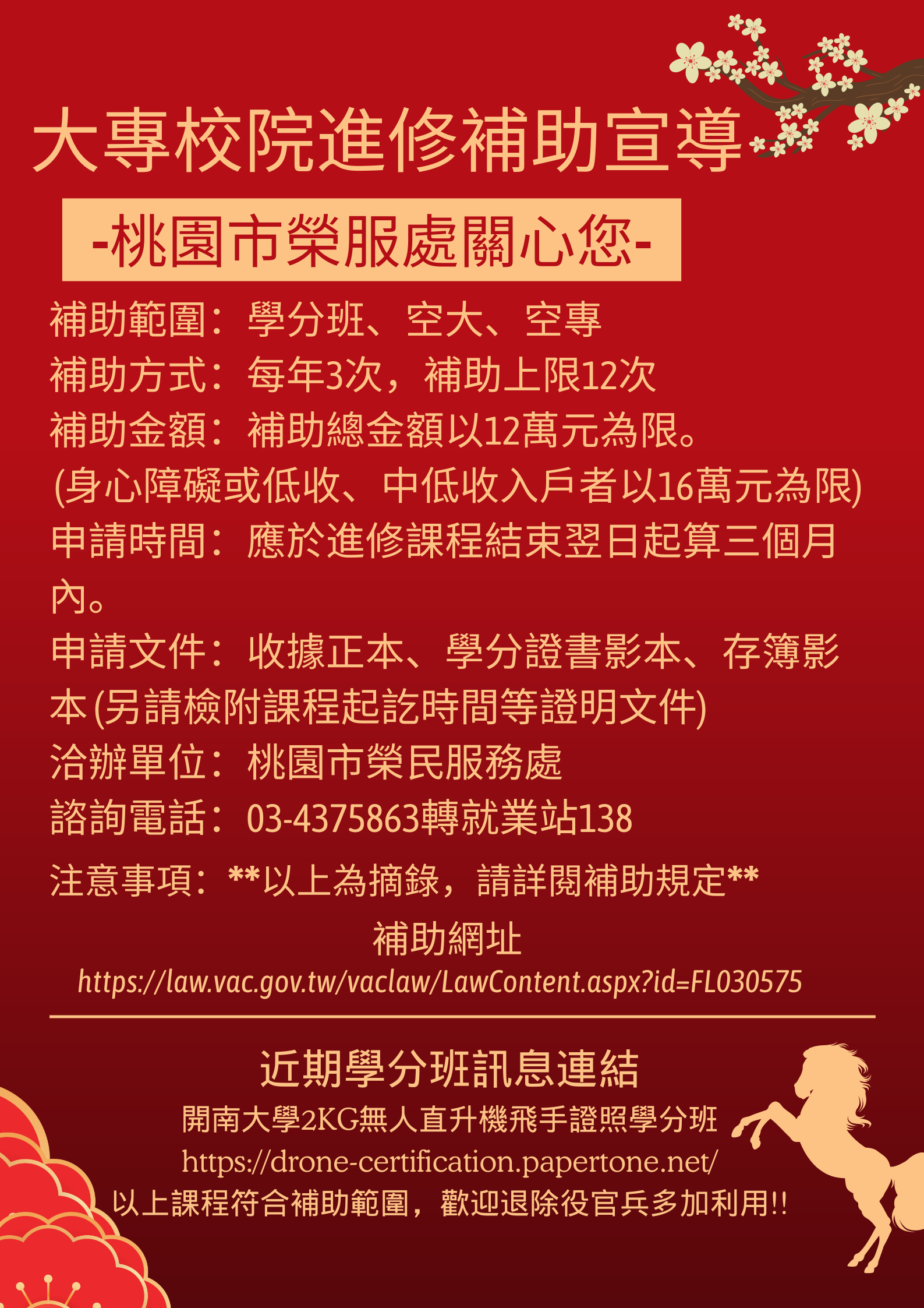 桃園市榮民服務處諮詢電話:03-4375863分機138江先生 補助網址~ https://law.vac.gov.tw/vaclaw/LawContent.aspx?id=FL030575 **近期學分班訊息連結~~ 開南大學2KG無人直升機飛手證照學分班: https://drone-certification.papertone.net/ 以上課程符合補助範圍,歡迎退除役官兵多加利用!!