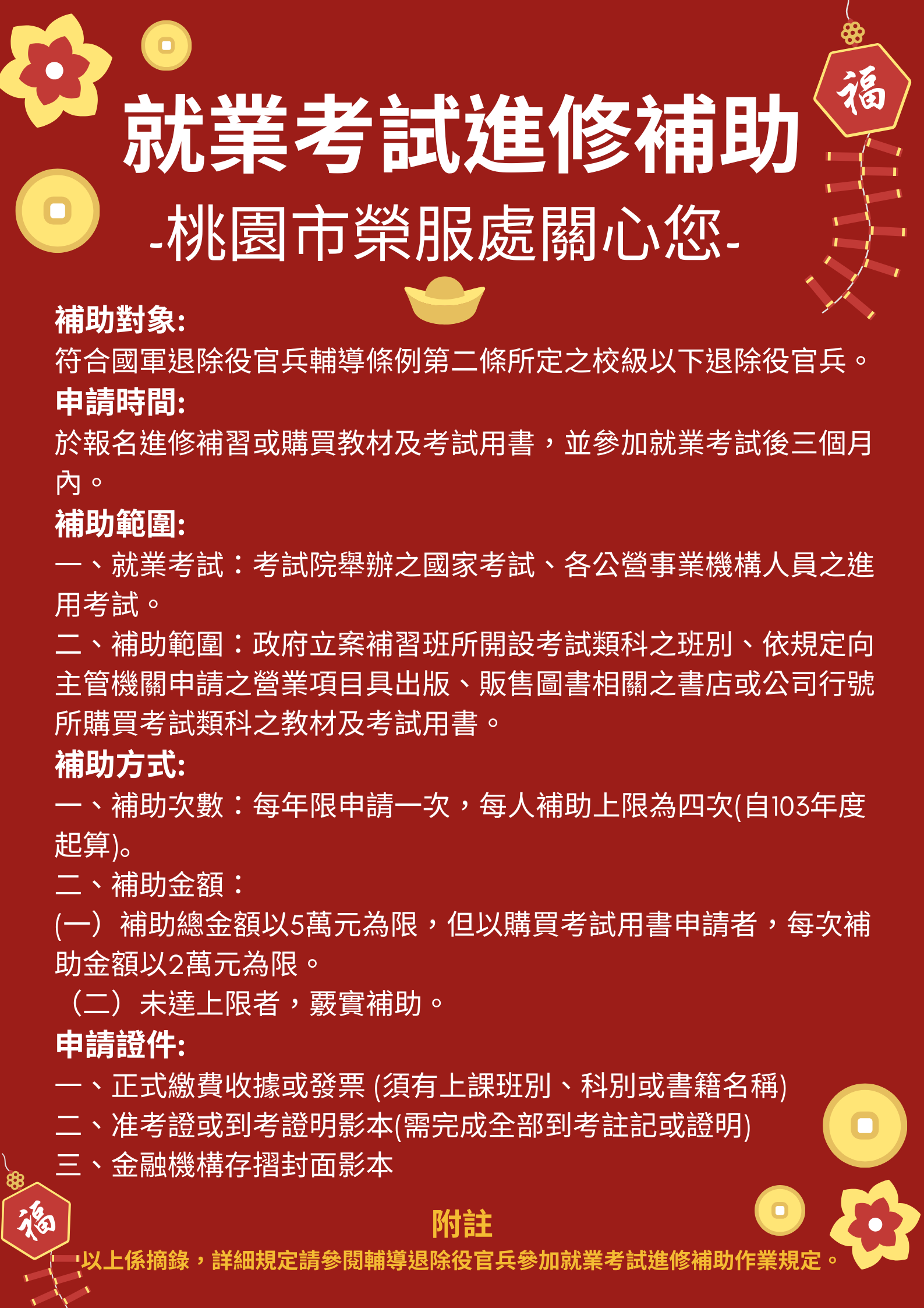 桃園市榮民服務處諮詢專線03-4375863分機138江先生 就業考試進修補助規定網址~~ http://law.vac.gov.tw/vaclaw/LawContent.aspx?id=FL030576