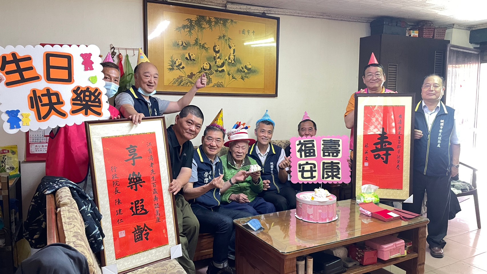 適逢桃園龍潭區榮民人瑞江伯伯百歲嵩壽,桃園市榮民服務處徐偉光處長偕同輔導員、社區服務組長及榮欣志工等人,於112年5月4日前往江伯伯府上祝壽,由徐偉光處長代表致贈總統、行政院長祝賀壽屏及輔導會大鵬主委紀念金飾,為江伯伯舉辦了一場難忘的百歲慶生。 江伯伯出生於民國13年,安徽省懷寧縣人,隨部隊來台,曾參與金門823砲戰後構築防禦工事,為國家盡忠職守,於64年退伍,退役後結婚生子,以鐵工及鑄模工維生,過著平和樸實的生活,江老先生個性溫和,從不與人爭吵,相當注重飲食健康,這就是他延年益壽的保健之道。徐處長帶領大家齊歡唱生日快樂歌,祝福江伯伯「福壽綿延、益壽延年」,伯伯非常開心的感謝榮服處精心安排的暖心祝壽,讓人覺得很感動又貼心,現場氣氛和樂融融。 徐偉光處長表示,敬佩榮民前輩年輕時投身軍旅、保衛國家的情操,使我們擁有現在富足與安康,希冀藉由祝壽活動,向榮民長輩表達尊崇與感謝,榮服處將持續秉持熱忱的態度,提供退除役官兵最優質的服務與照顧,讓長者都能健康快樂的生活。