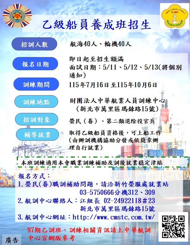 中華航業人員訓練中心乙級船員養成班97期招生中!