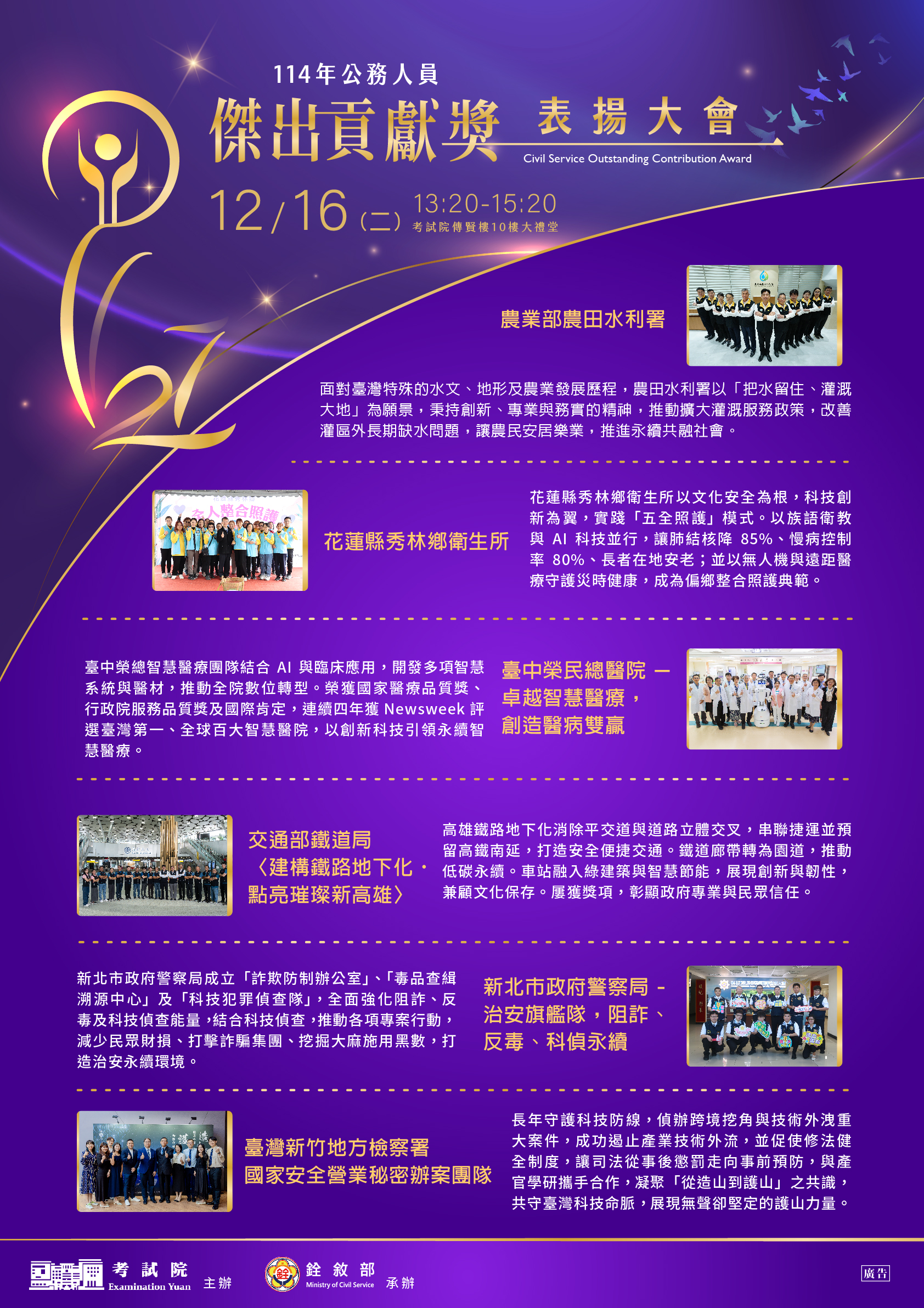114年公務人員傑出貢獻獎表揚大會於114年12月16日下午13:20~15:20於考試院傳賢樓10樓大講堂舉行