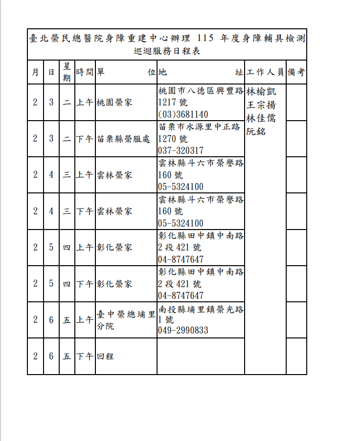 臺北榮民總醫院身障重建中心辦理 11 5 年度身障輔具檢測巡迴服務