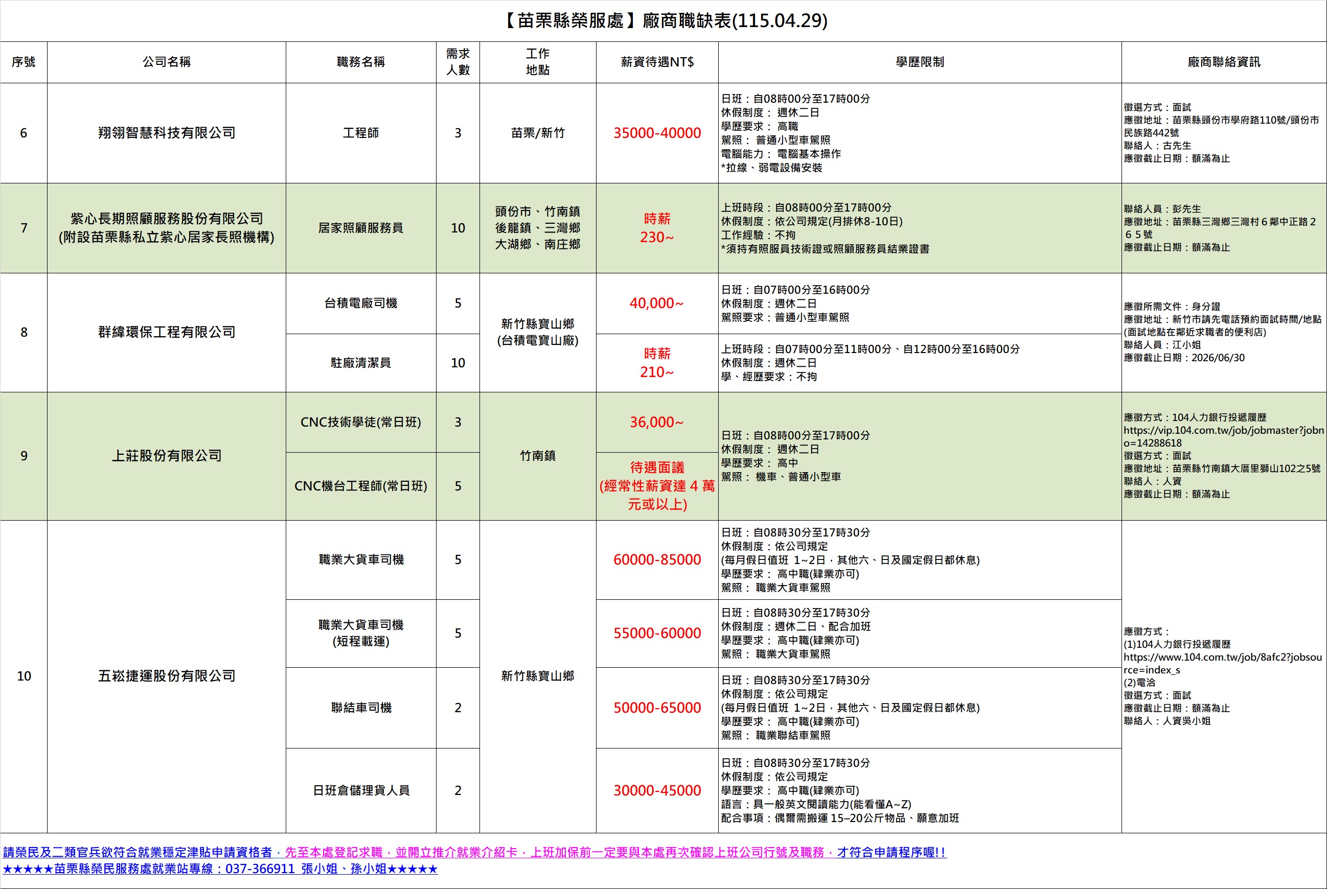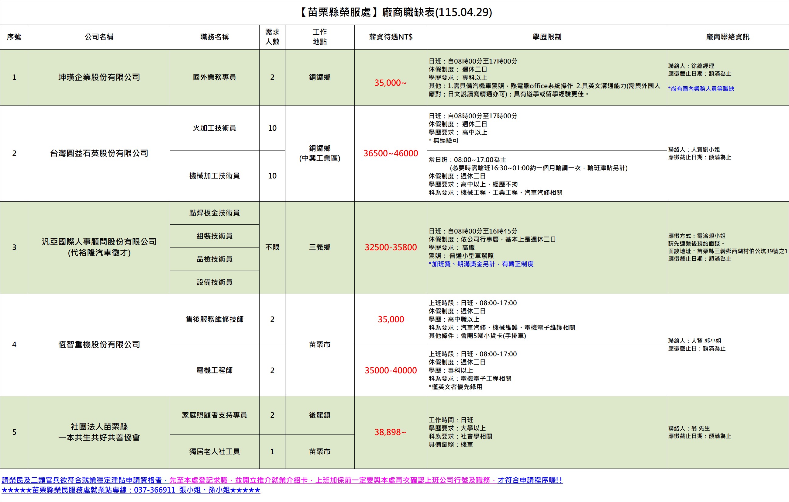 【苗栗縣榮服處】廠商職缺表(115.04.29)