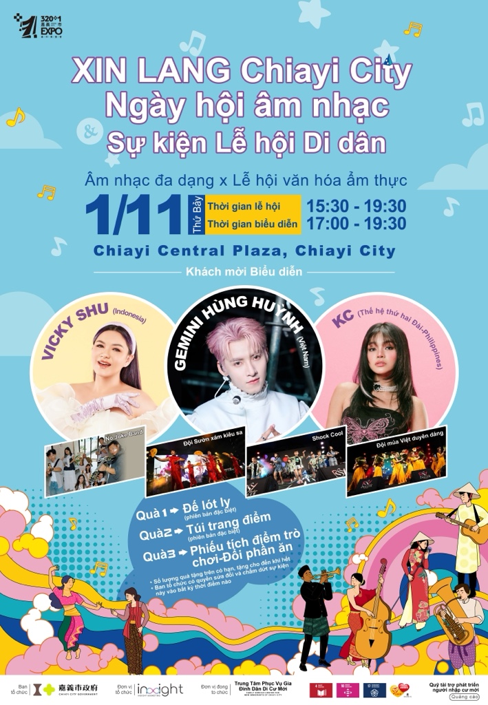 錯過去年的熱情?今年,不容再錯過!今年擴大結合辦理 2025 嘉城新浪音樂節 & 移民節活動, 🎤 邀請來自越南、印尼的國際歌手 🌍 印尼流行天后 Vicky Shu 💃 越南唱跳新星Gemini Hùng Huỳnh 黃輝雄 🎶 台菲新二代創作歌手 KC 施佳玲 還有嘉義在地新住民團體與新二代樂團也將輪番上陣,在嘉義市中央廣場同台演出,從越洋歌聲到熱情舞曲,帶來最震撼的文化交流!