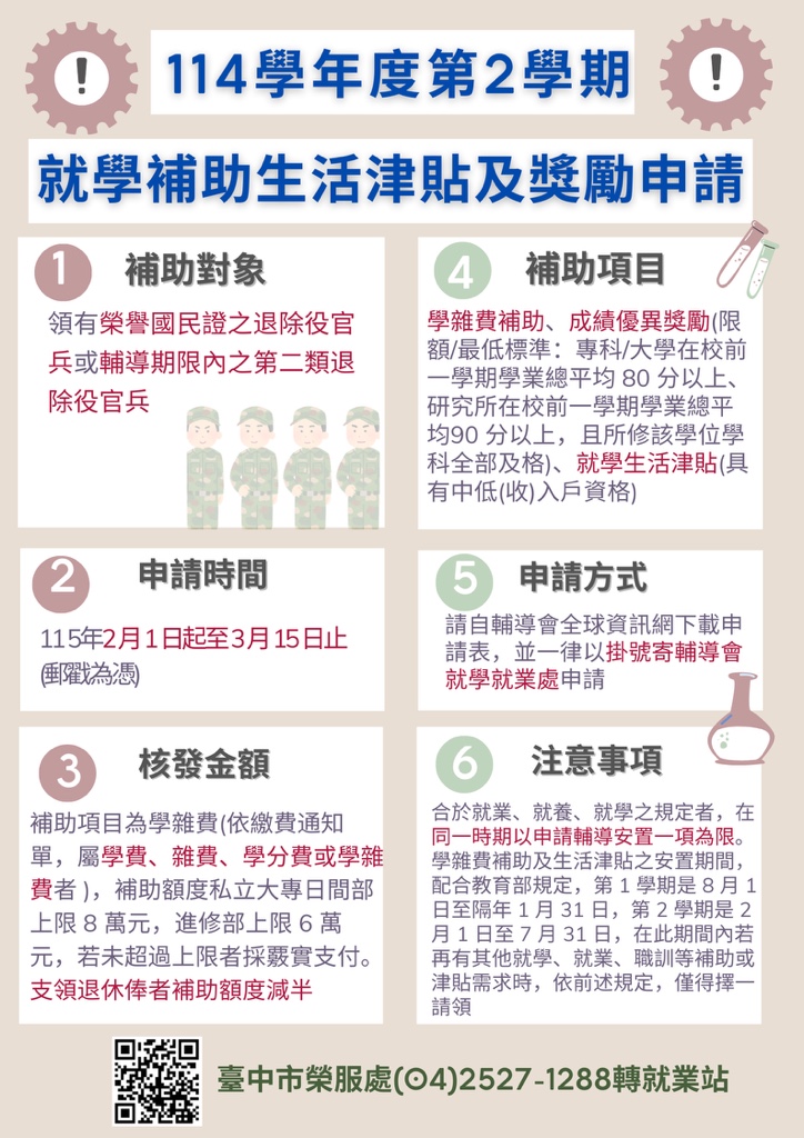 [就學服務]114 學年度第2 學期退除役官兵就學補助生活津貼及獎勵申請資訊