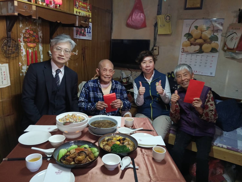 為關懷年長榮民眷及家庭,讓他們在春節也能感受年節的溫暖,臺中榮民服務處連結臺中榮民總醫院、財團法人臺中市私立惠康社會福利基金會、臺中福華大飯店攜手獻愛,結合社會資源寒冬送暖,贊助百份五星主廚年菜,今(12)日臺中榮服處王怡文處長,帶領輔導員、社區服務組長,陪同臺中榮總傅雲慶院長及臺中福華大飯店餐飲部協理何松育、張清傑主廚,前往烏日區榮民尹𪿖吉爺爺家中溫馨圍爐、歡聚過好年,與尹爺爺一同享用熱騰騰的年菜,提前向尹爺爺拜年,傳遞滿滿祝福與關懷。 此次活動由臺中榮總、惠康基金會及臺中福華大飯店贊助,除了陪伴尹爺爺圍爐團圓外,福華主廚團隊還用心準備一組6道豐盛的年菜組合,透過臺中榮服處社區志願服務組長親送到府,不僅關心長輩生活起居與身體狀況,並致贈新春祝福,收到年菜的榮民眷紛紛表達感謝,臉上洋溢著幸福笑容,場面溫馨感人。 王怡文處長特別感謝臺中榮總、惠康基金會及臺中福華大飯店合力協助,此次跨機構合作,不僅展現公私協力的良好典範,也讓愛與關懷在新春佳節前夕,走進每一個需要被照顧的家庭,為新的一年揭開溫暖序幕,並期盼藉此活動拋磚引玉綿延愛心,讓長者們在歲末寒冬之際,感受到年節氣氛開心過年。