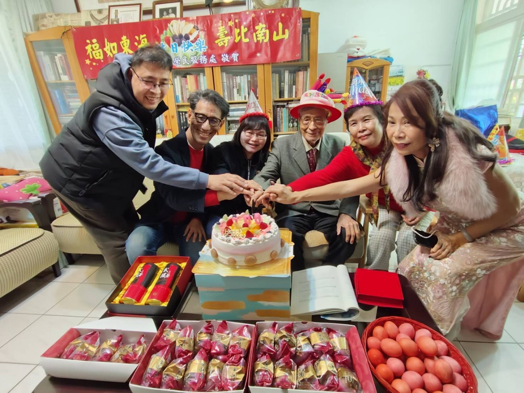 榮民魏元珪爺爺本(29)日歡度百歲生日,臺中市榮民服務處謝秀芬副處長率責任區輔導員、社區服務組長、榮欣志工,並邀請華山基金會社工一同前往魏府溫馨祝壽,謝副處長轉贈總統及行政院院長祝賀壽屏,並代表輔導會主任委員致贈金飾賀禮,帶領齊聲高唱生日快樂歌,握著魏爺爺的手和大家共同切生日蛋糕。隨後在場所有人一起分享人瑞的福氣與喜氣,並現場獻上吉祥祝福話及領取壽桃、紅蛋,祝福魏爺爺「福如東海、壽比南山」。
