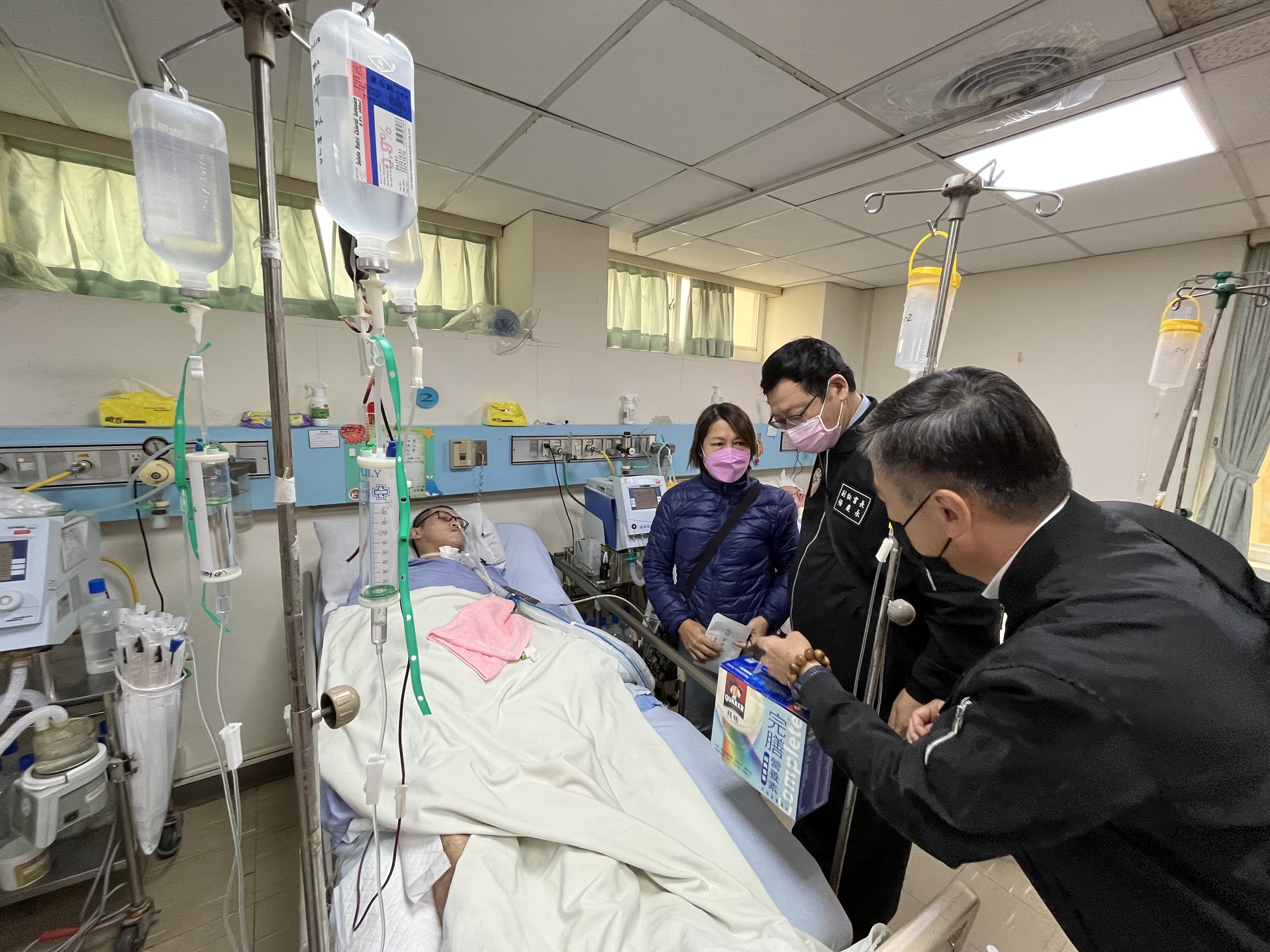 和美鎮榮眷因工作中自高處摔下致呼吸衰竭,需使用呼吸器持續於醫院治療,經彰化縣榮服處協助申請身心障礙證明並轉介榮民榮眷基金會申請重大災害救助金,審查通過於日前核發;榮民榮眷基金會副秘書長楊慶永,今(12)日特地南下,由彰化縣榮服處鍾翔宇副處長陪同,親至醫院探視榮眷以表達關懷之意,祝福榮眷早日康復,並慰勉家屬的辛苦照顧,給予情緒支持,請其務必保重身體。 榮民榮眷基金會重大災害救助金救助對象為:退除役官兵或其眷屬、遺眷因遭受重大災害、意外事故,致死亡或重度身心障礙以上,並具低收入戶、中低收入戶身分或領取中低收入老人生活津貼者。應檢附資料為:1.申請人及事故人員身分證明文件。2.屬意外亡故,須附檢察機關開立之相驗屍體證明書。3.屬低收入戶、中低收入戶身分或領取中低收入老人生活津貼者,須附縣(市)政府核發之證明。4.屬重度身心障礙,須附縣(市)政府核發之身心障礙手冊。5.屬就養退除役官兵之遺眷,須附榮民服務處查訪記錄。申請救助者,應於災害或事故發生後六個月內,檢具相關資料,洽請各榮民服務處協助辦理,轉財團法人榮民榮眷基金會核發。