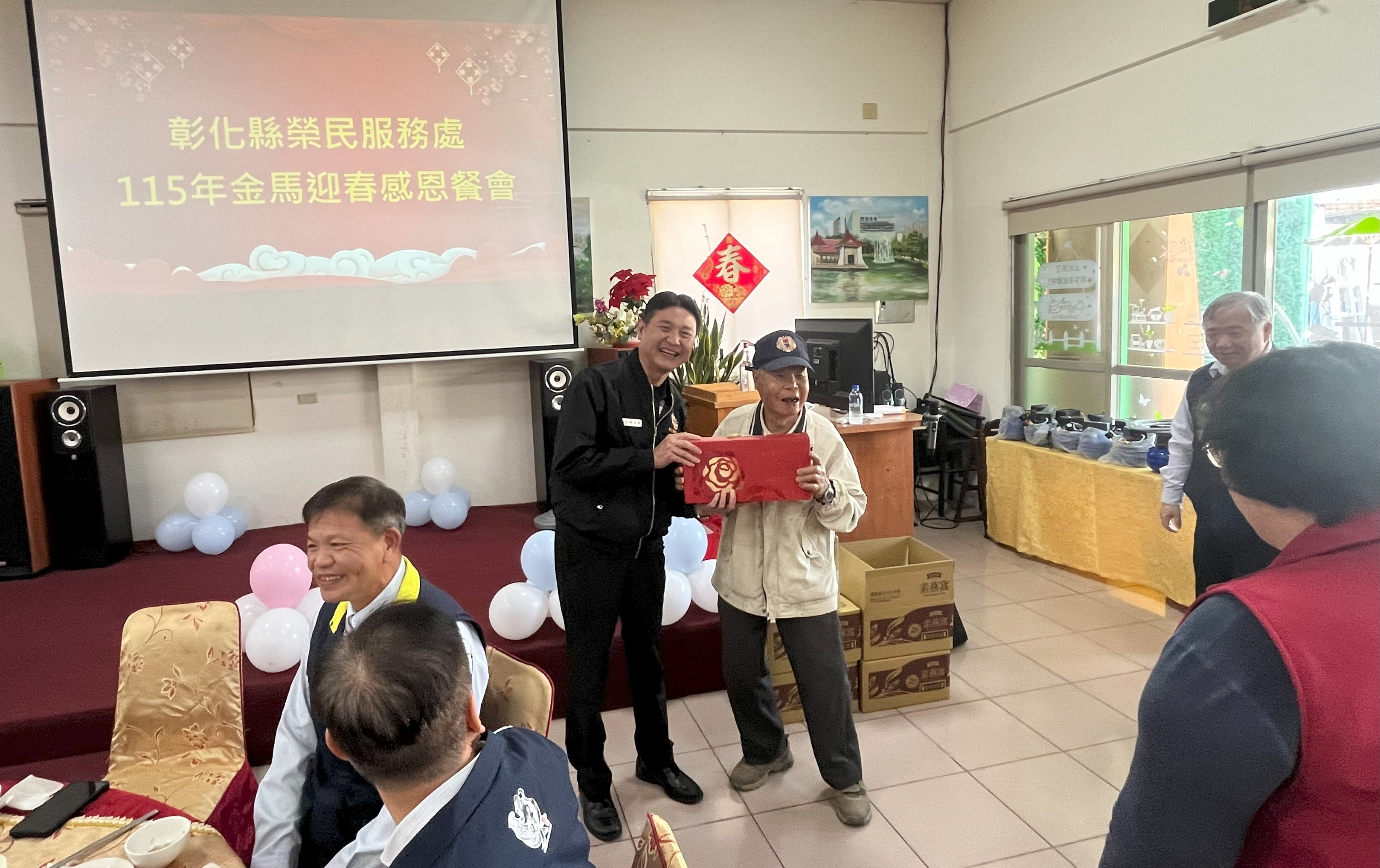 為關懷轄區榮民及眷屬,彰化縣榮民服務處於農曆春節前,分別於南彰化、中彰化及北彰化地區辦理三場次「金馬迎春感恩餐會」圍爐活動,邀請榮民長輩、眷屬、榮欣志工及各界貴賓齊聚一堂,以團圓餐敘方式提前迎接新年,現場氣氛溫馨熱鬧,讓榮民長輩在歲末年終之際,感受到社會滿滿的關懷與祝福。 處長邱文俊表示,榮民長輩一生為國家與社會奉獻心力,是國家重要的資產,榮服處秉持輔導會嚴主任委員「榮民在哪裡,服務到哪裡」的政策精神,於年節前辦理感恩圍爐活動,希望透過面對面的陪伴與關懷,讓榮民及眷屬能在溫馨的氛圍中共享團圓時光,感受到被重視、被照顧的溫暖。 本次感恩餐會亦獲得多家企業與醫療院所熱情參與與支持,其中彰濱秀傳紀念醫院黃信彰院長亦親自出席活動,展現對榮民族群的高度關懷。黃院長於餐會中表示,榮民長期為國家付出與犧牲,醫療院所應以實際行動回饋社會,提供便利且優質的醫療照顧,是責無旁貸的使命。彰化縣榮服處日前已與彰濱秀傳紀念醫院完成合作備忘錄簽署,提供榮民及相關對象免掛號費等優惠措施,嘉惠彰化地區逾萬名榮民及其家庭,有效減輕就醫負擔並提升就醫便利性。 邱處長進一步指出,榮服處各項服務能順利推動,仰賴社會各界的共同投入與支持,未來將持續結合地方企業、醫療院所及公益資源,深化對榮民及眷屬的照顧工作,透過多元活動與貼心服務,讓關懷不間斷、陪伴不缺席。邱文俊處長也特別在活動中向全體榮民及眷屬獻上新年祝福,祝福長輩們身體健康、平安順心,期盼在新的一年,榮服處能持續成為榮民眷屬最堅實的後盾,陪伴大家安心生活、迎向更美好的每一天。 相關照片