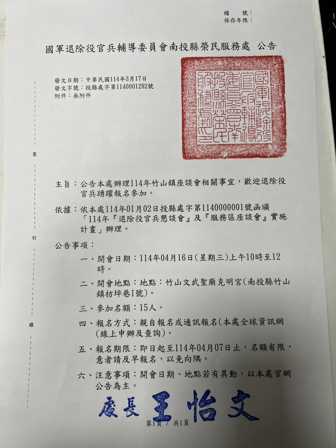 主旨:公告本處辦理114年竹山鎮座談會相關事宜,歡迎退除役官兵踴躍報名參加。 依據:依本處114年01月02日投縣處字第1140000001號函頒「114年『退除役官兵懇談會』及『服務區座談會』實施計畫」辦理。 公告事項: 一、開會日期:114年04月16日(星期三)上午10時至12時。 二、開會地點:地點:竹山文武聖廟克明宮(南投縣竹山鎮枋坪巷1號)。 三、參加名額:15人。 四、報名方式:親自報名或通訊報名(本處全球資訊網(線上申辦及查詢)。 五、報名期限:即日起至114年04月07日止,名額有限,意者請及早報名,以免向隅。 六、注意事項:開會日期、地點若有異動,以本處官網公告為主。