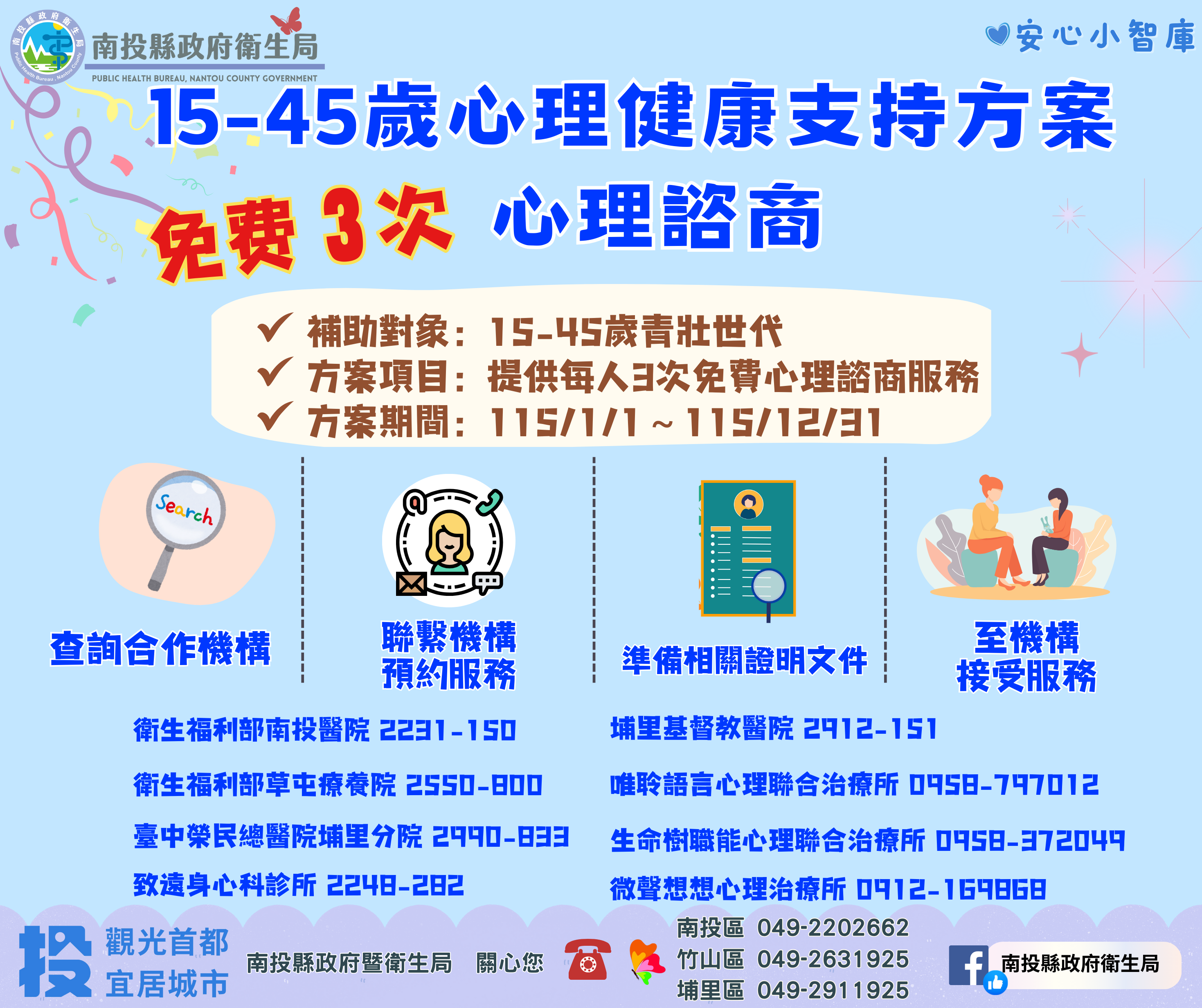 南投縣政府衛生局函「為促進縣民心理健康,請協助推廣衛生福利部115年度『15-45歲青壯世代心理健康支持方案』