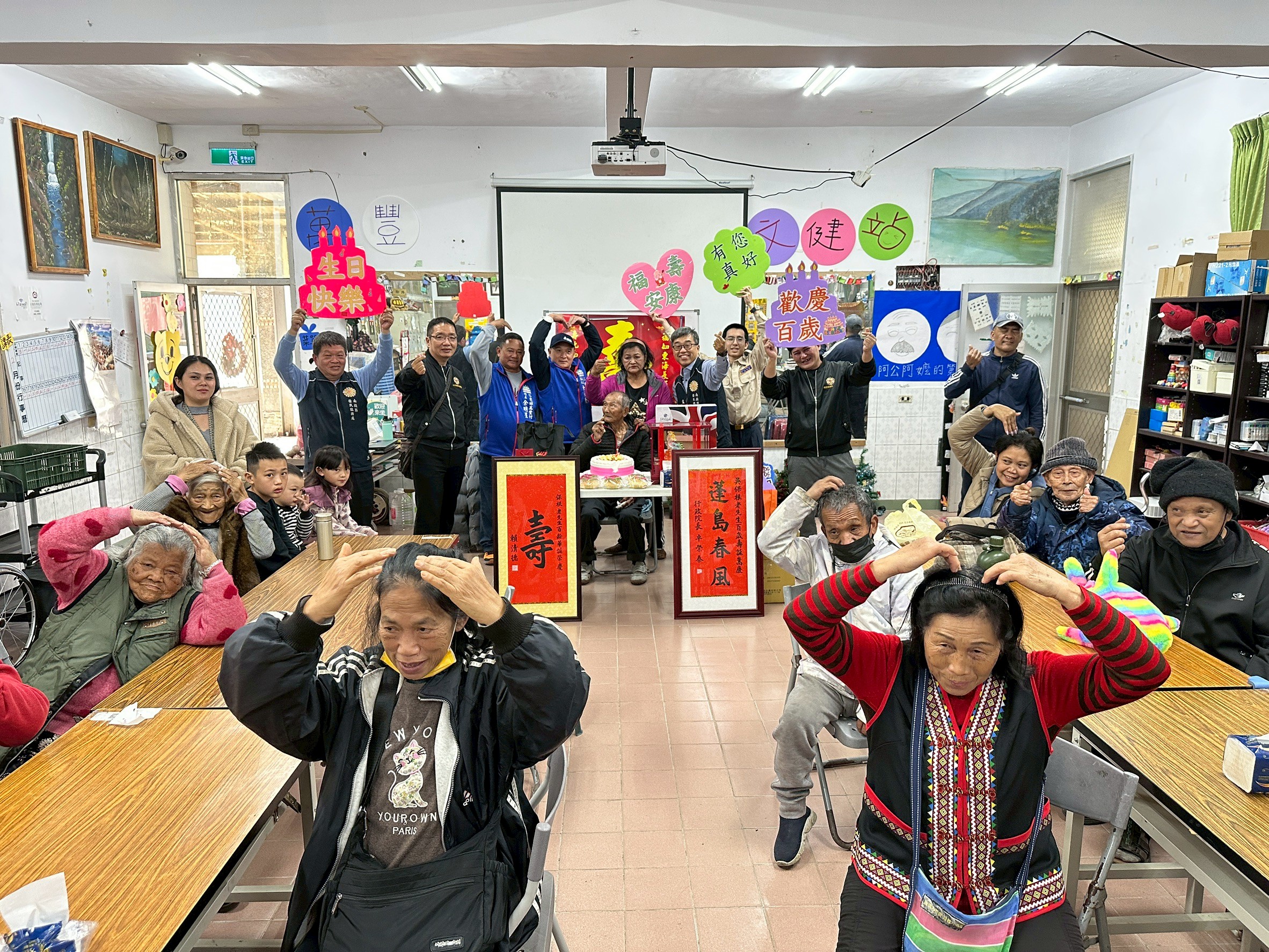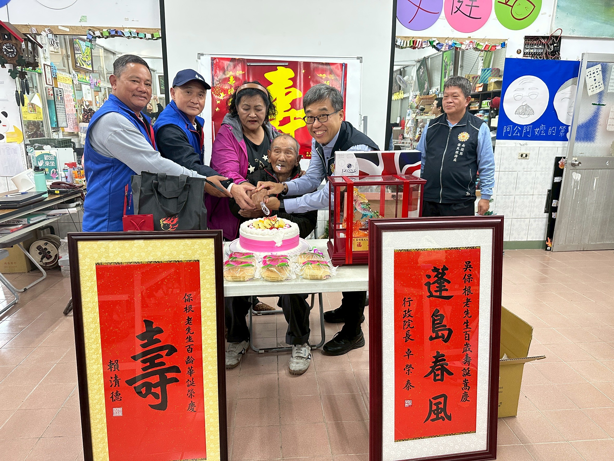 農曆新年前夕,喜迎仁愛鄉榮民人瑞吳保根伯伯百歲壽辰,南投縣榮民服務處李毓錫處長帶領同仁前往萬豐村文健站辦理百歲慶生活動,並邀請仁愛鄉公所、萬豐村長、萬豐社區發展協會、榮欣志工及文健站的長輩們一同參與,恭賀伯伯百歲嵩壽! 百歲慶生活動由眾人生日快樂歌聲揭開序幕,李處長首先代表轉贈總統、行政院長百歲賀屏及輔導會主任委員祝壽平安金飾與欣中天然氣公司賀壽禮券,榮服處也準備了營養補充品禮盒。仁愛鄉民政課余永康課長致贈鄉長百歲賀禮、萬豐村余明星村長及萬豐社區發展協會余陳秀菊理事長也獻上賀詞,文健站的長輩們也準備原住民舞蹈同樂。吳伯伯對來賓及各界的盛情祝賀,內心喜悅之情溢於言表;席間吳伯伯將榮服處準備的蛋糕與壽桃分送與會來賓,祝福參與活動每位嘉賓喜樂安康,現場洋溢歡樂的氣氛、溫馨熱鬧。 吳伯伯遼寧遼陽縣人,軍旅退伍後時常參加社區活動,平日生活簡樸,身體硬朗,養生有道,日常生活開朗樂觀,悠活自在。李處長表示,榮民前輩一生為國家奉獻心力,退伍後在社會亦默默付出不求回報,精神令人感佩,關懷退伍袍澤,提供完善服務照顧是榮服處核心工作及任務,榮民老前輩們為國家社會的付出與奉獻,無私精神足為全民表率,服務處希望能藉由祝壽活動,讓長者感受到輔導會的溫馨關懷,並表達對吳伯伯崇高敬意與祝福,祝願伯伯身體健康,一切平安順遂,生日快樂。 相關照片