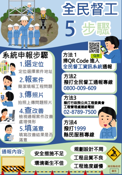 行政院公共工程委員會為加強導全民督工,已擬定LED電子看板宣導標語「全民督工來通報,工程品質好更好,全民督工專線0800-009609」(督督工,來督工),或使用全民督工網路通報系統。