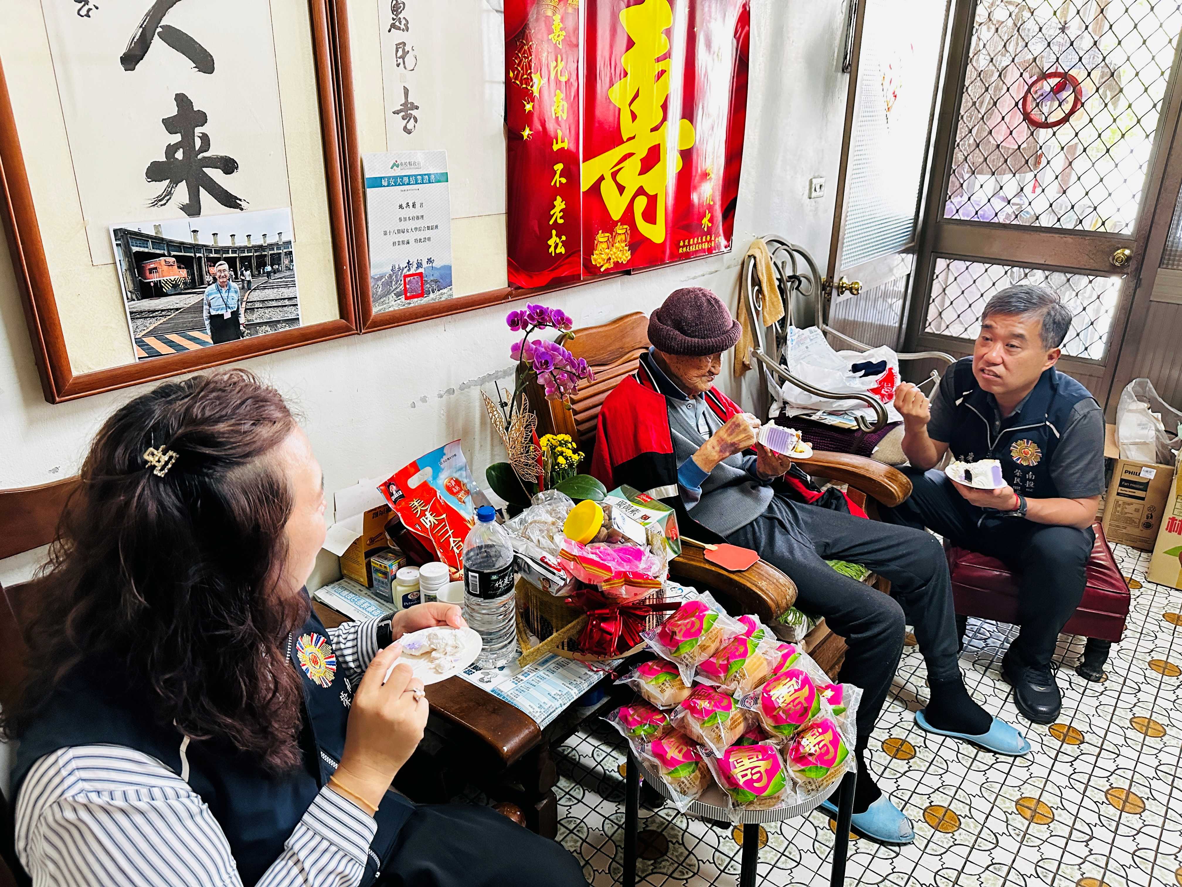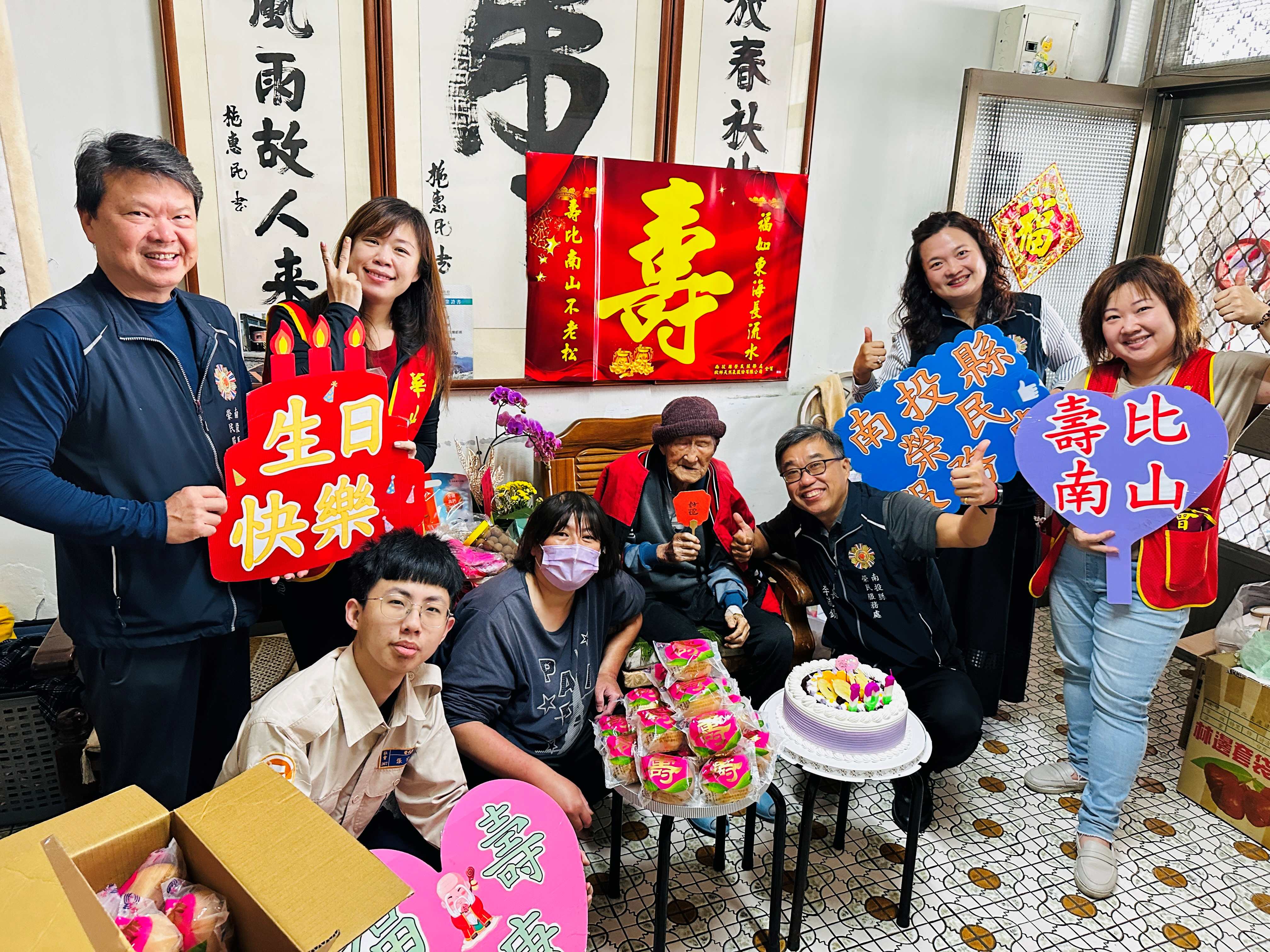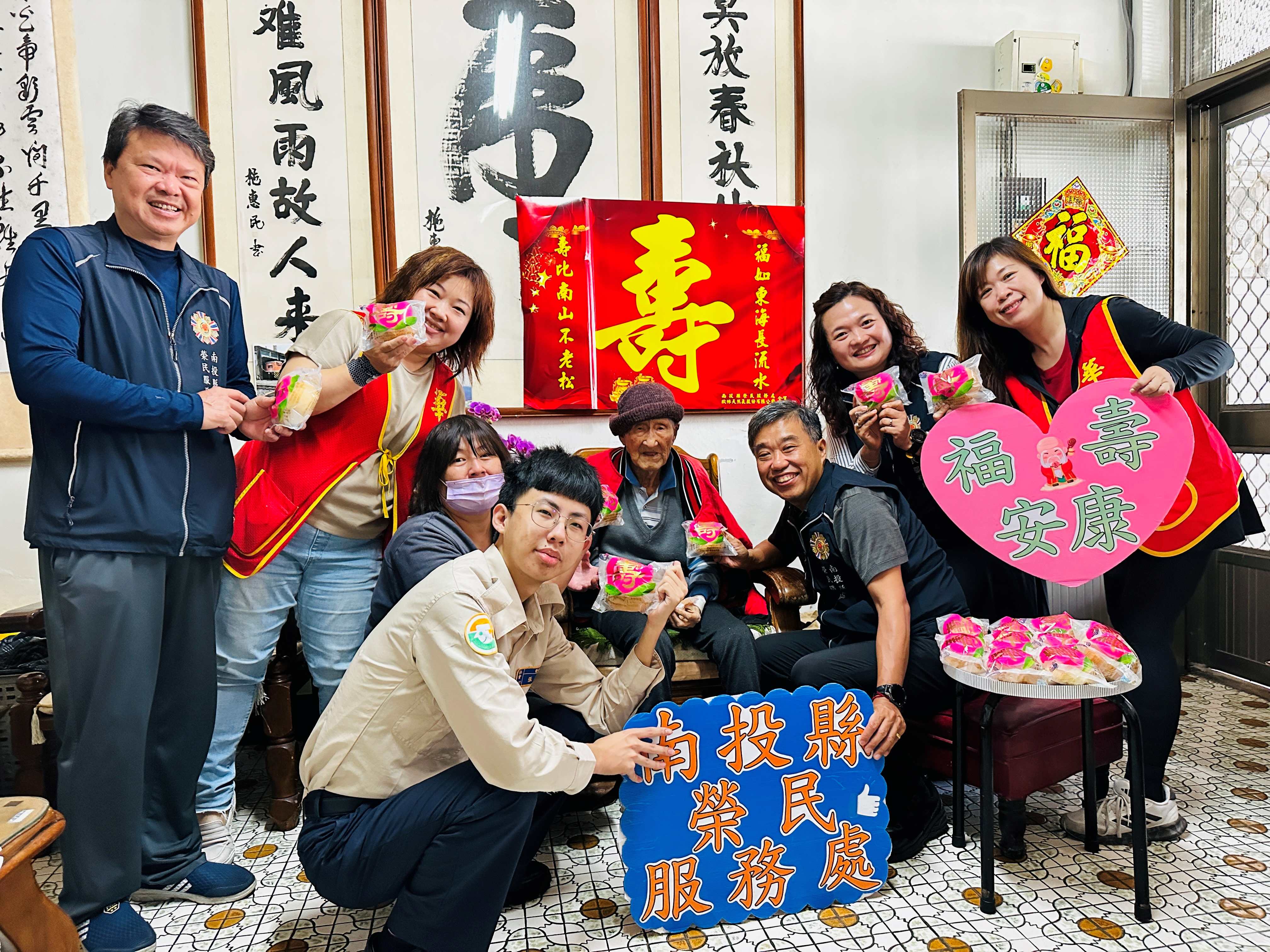 魚池鄉榮民人瑞施惠民101歲壽辰,南投縣榮民服務處李毓錫處長帶領同仁並邀請華山基金會南投區社工一同前往祝壽,李處長首先致贈營養補充品禮盒,並轉贈欣中天然氣公司賀壽禮券,華山基金會南投區社工也獻上賀禮。席間施伯伯將榮服處準備的壽桃分送與會來賓,現場洋溢歡樂的氣氛。眾人並歡唱生日快樂歌祝福福壽安康,讓施伯伯感受到榮服處的溫馨祝福與關懷。