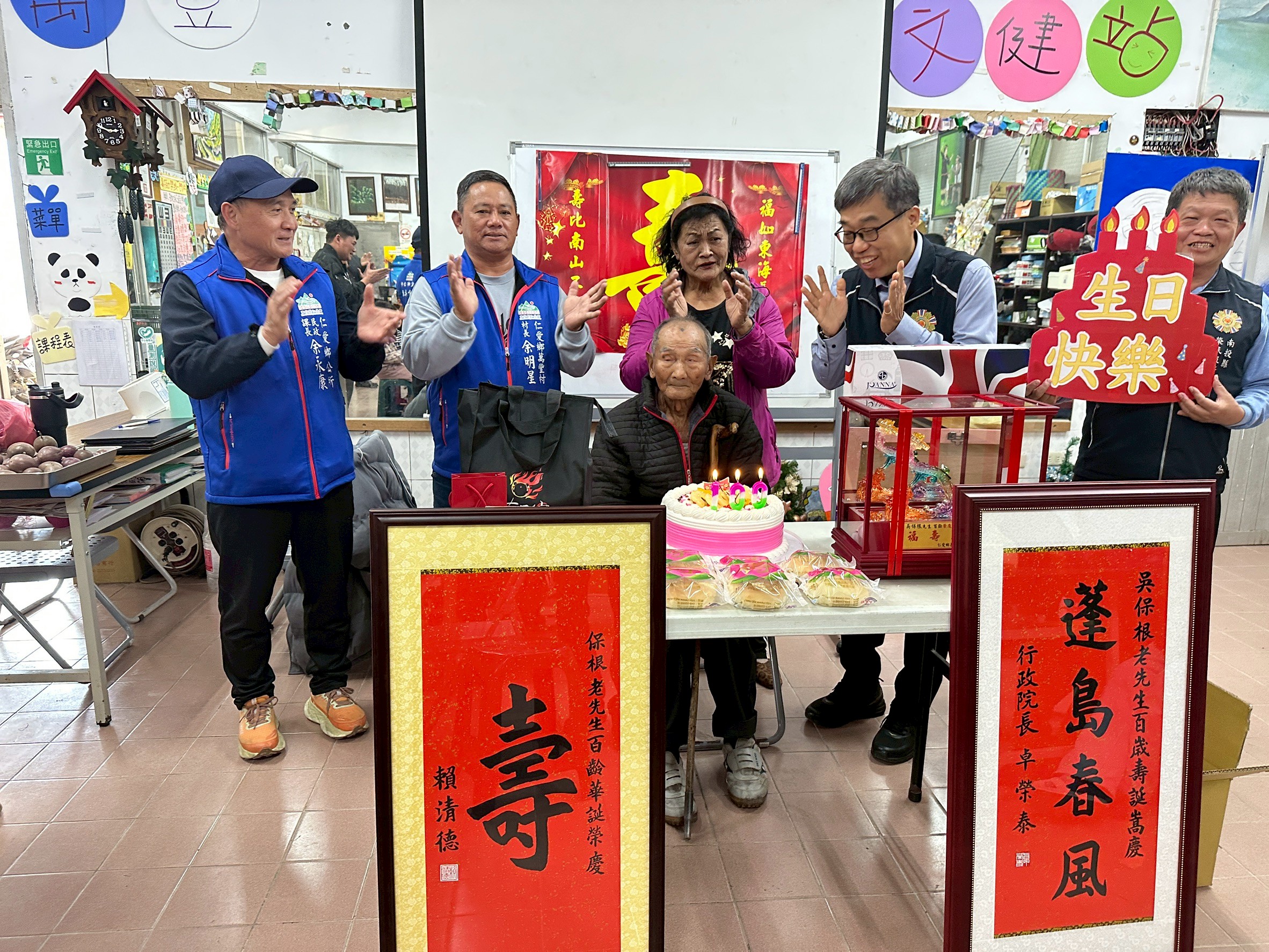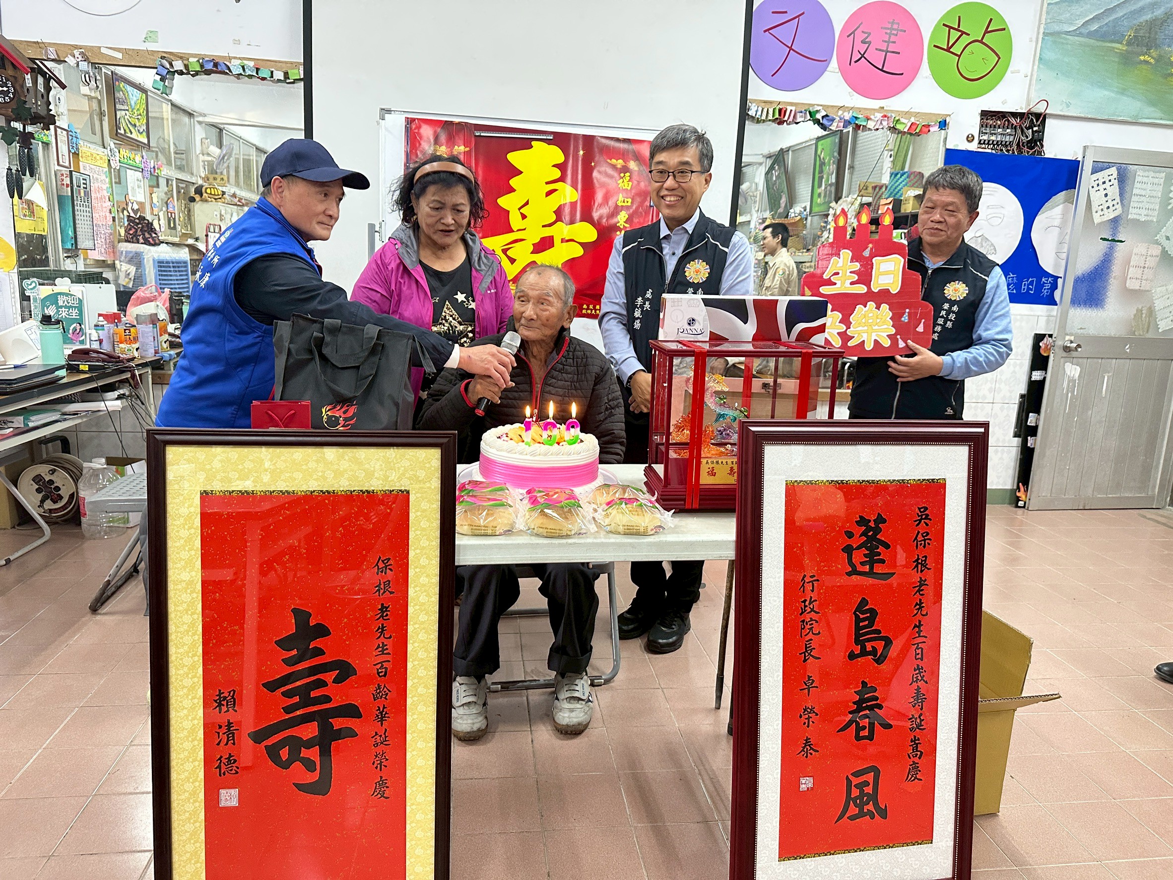 農曆新年前夕,喜迎仁愛鄉榮民人瑞吳保根伯伯百歲壽辰,南投縣榮民服務處李毓錫處長帶領同仁前往萬豐村文健站辦理百歲慶生活動,並邀請仁愛鄉公所、萬豐村長、萬豐社區發展協會、榮欣志工及文健站的長輩們一同參與,恭賀伯伯百歲嵩壽!