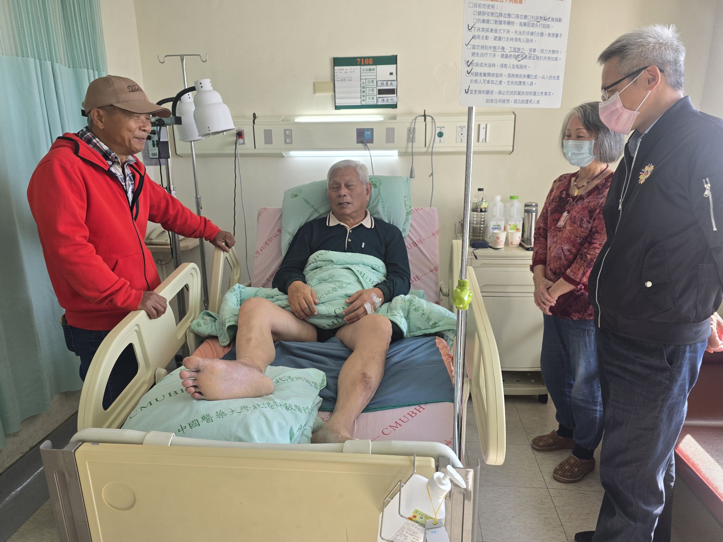 雲林縣榮民服務處處長與副處長及榮欣志工隊郭隊長,日前往雲林北港媽祖醫院,關懷慰問近日因病進行手術治療的榮民暨榮欣志工郭瑞福,致上誠摯祝福,期盼他早日康復、健康平安。 榮民郭瑞福現居四湖鄉,公務員退休後投入服務榮民眷志願服務的榮欣志工。多年來,他與妻子共同參與長期投入服務訪視與居家關懷榮民長輩。尤其夫婦二人經常到訪現年105歲居住於四湖鄉的抗戰英雄林伯伯,訪視時發現前幾日林伯伯跌倒行動不便除向榮服處反映外,並主動協助日常關懷與陪伴,深受榮民長輩與地方社區一致肯定。 榮民長輩們提到郭瑞福夫婦時,常以「服務熱忱、待人溫暖」稱讚不已。此次得知榮民郭瑞福手術住院,雲林縣榮服處第一時間前往探視,除關心術後恢復情形,也向其家屬表達支持與慰問,並鼓勵他安心休養,早日恢復健康,再與志工夥伴一同服務榮民眷與社會。 雲林縣榮服處表示,榮欣志工是服務榮民眷的重要力量,更是社會溫暖的實踐者。此次探視不僅是關懷志工夥伴的健康,也期盼讓每位奉獻付出的志工感受到榮服處的重視與支持。榮服處將持續秉持「榮民在哪、服務到哪」精神,提供即時關懷與協助,歡迎加入榮欣志工請撥打05-5322742轉8019洽賈維忠輔導員。