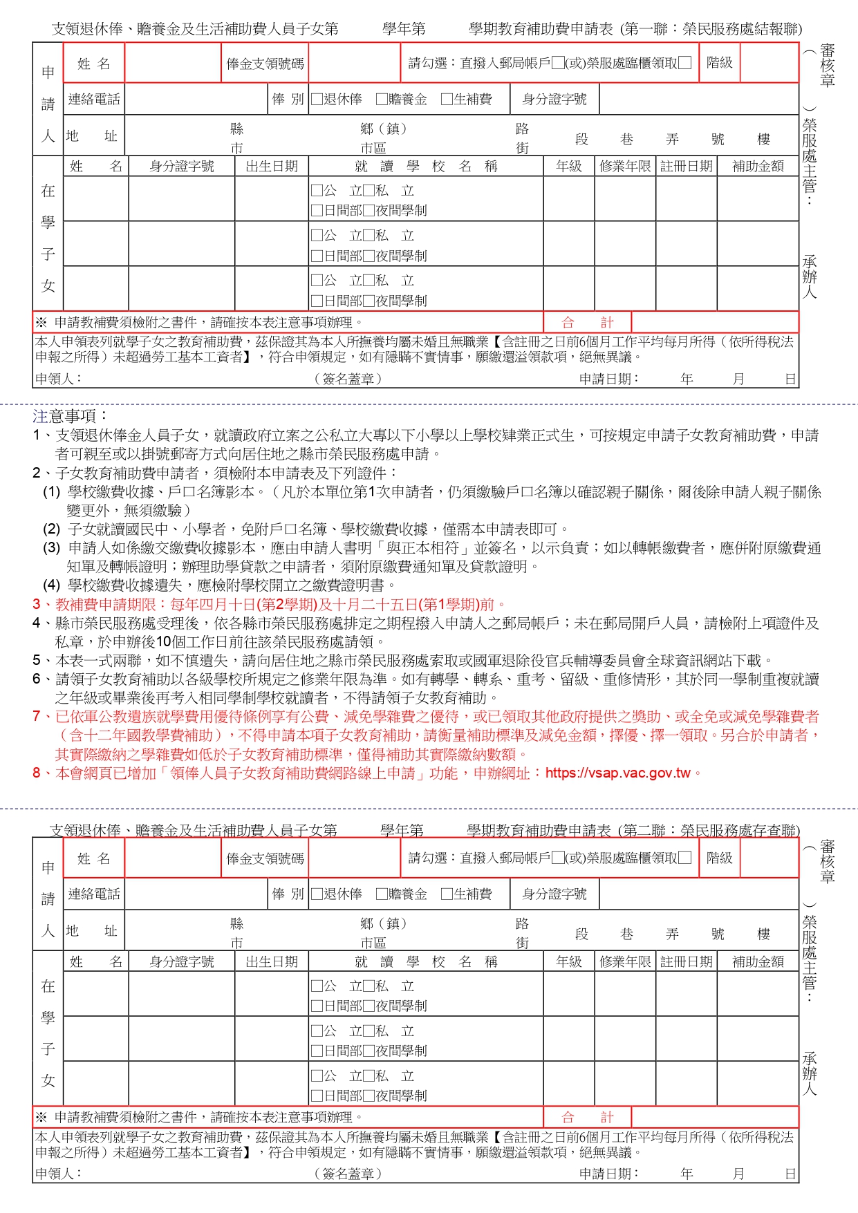領有退休俸人員(中校以下)子女114學年第2學期子女教補費申請注意事項: 一、子女就讀公私立大專院校,請向學校繳納全額學費,即日 - 4/10日前檢附1.申請表、2.繳費收據或就學貸款或信用卡繳費證明單、3.註冊通知單及4.戶口名簿影本(第1次申請)向榮服處提出申請(可臨櫃、郵寄或線上申辦)。 二、行政院補貼校內住宿費5000元,不影響申請。 三、基於政府學雜費補助不重複請領原則,若同時具有各類就學費用減免辦法或其他部會助學補助等資格,請擇優擇一辦理不得重複。 四、私校請放棄行政院減免學雜費17,500元,務必確認學雜費繳費單的「行政院減免學雜費」的欄位為0元,才可辦理教補費申請。 五、子女有打工,114年8月-115年1月份平均薪資不得超過最低基本薪28,590元至29,500元 。 六、歡迎使用榮民子女教育補助、就學補助及獎學金線上申辦系統(含申請表下載):https://vsap.vac.gov.tw/ 附件下載