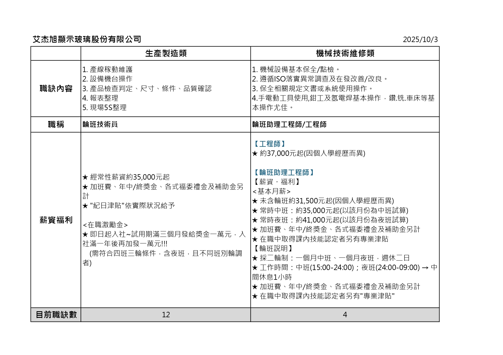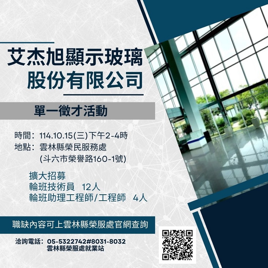 114年10月艾杰旭顯示玻璃股份有限公司單一徵才活動