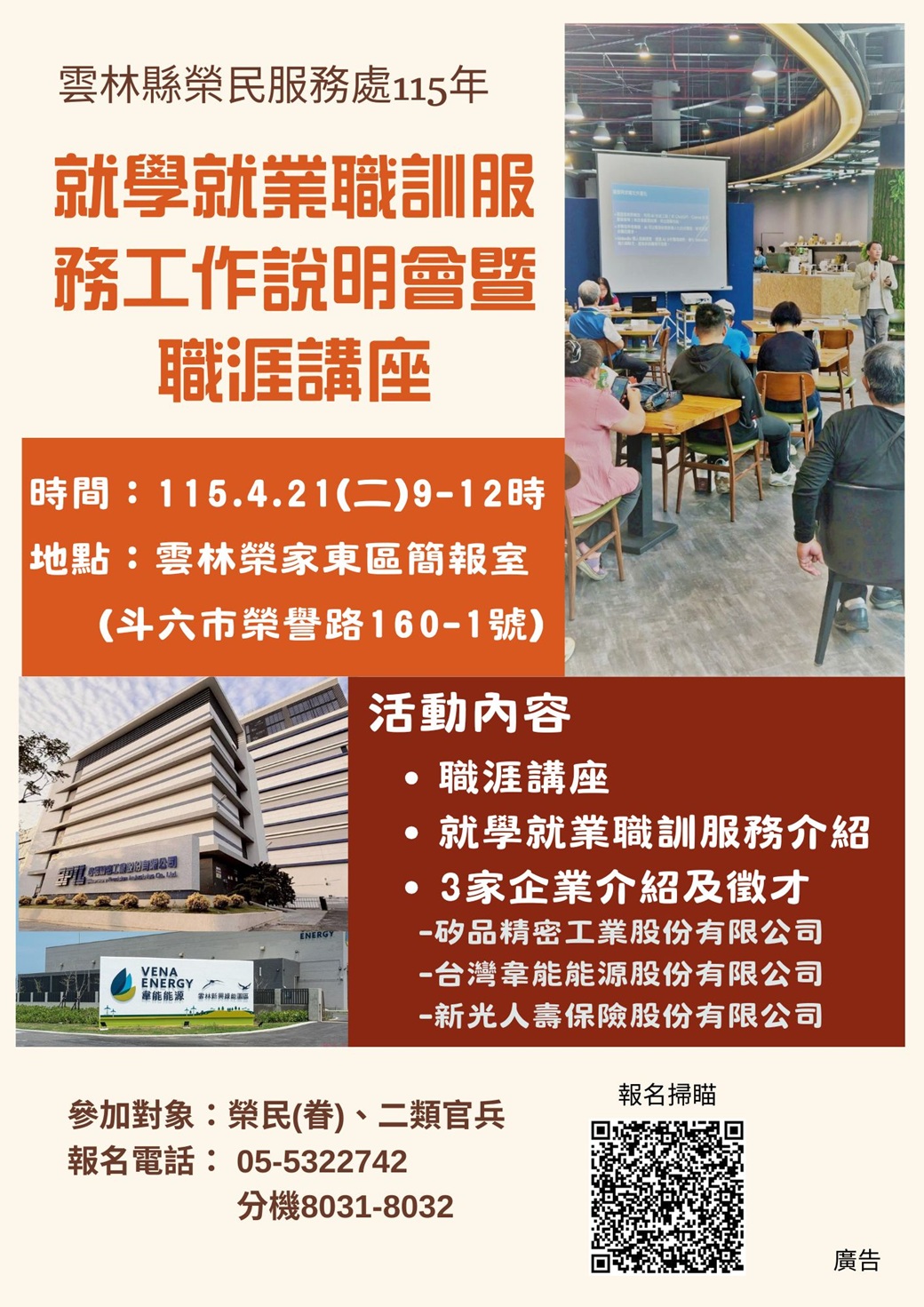 時間:115.4.21(二)9:00-12:00 地點:雲林榮家東區簡報室(斗六市榮譽路160-1號2樓) 線上報名網址:https://forms.gle/xPAoYELkuSHm7mys9 報名電話:05-5322742分機8031、8032