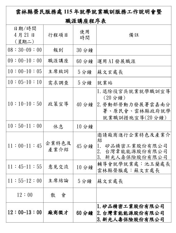 不想錯失輔導會的各項學業訓補助措施 歡迎報名參加說明會 會後還安排矽品精密韋能能源公司及新光人壽到場徵才 名額有限 歡迎榮民(眷)、輔導期限內二類官兵踴躍報名