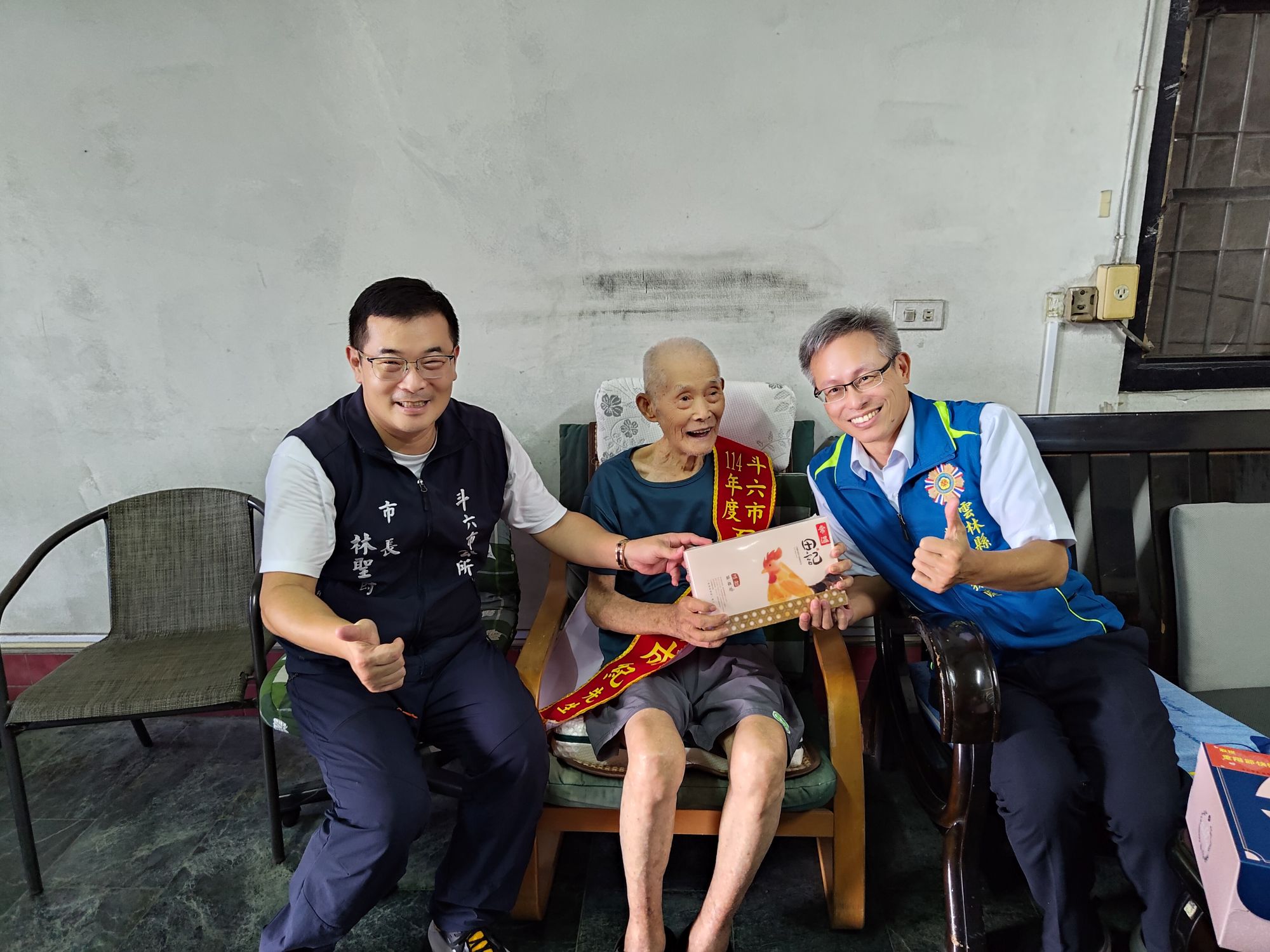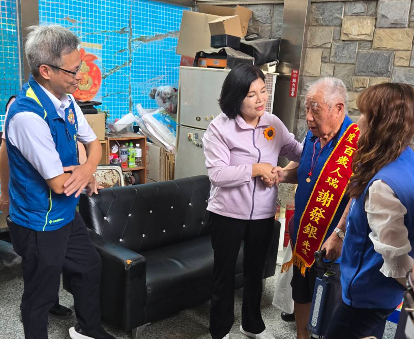 圖3-蘇文玄處長和雲林縣張麗善縣長、林聖爵市長拜訪百歲榮民王天福伯伯。