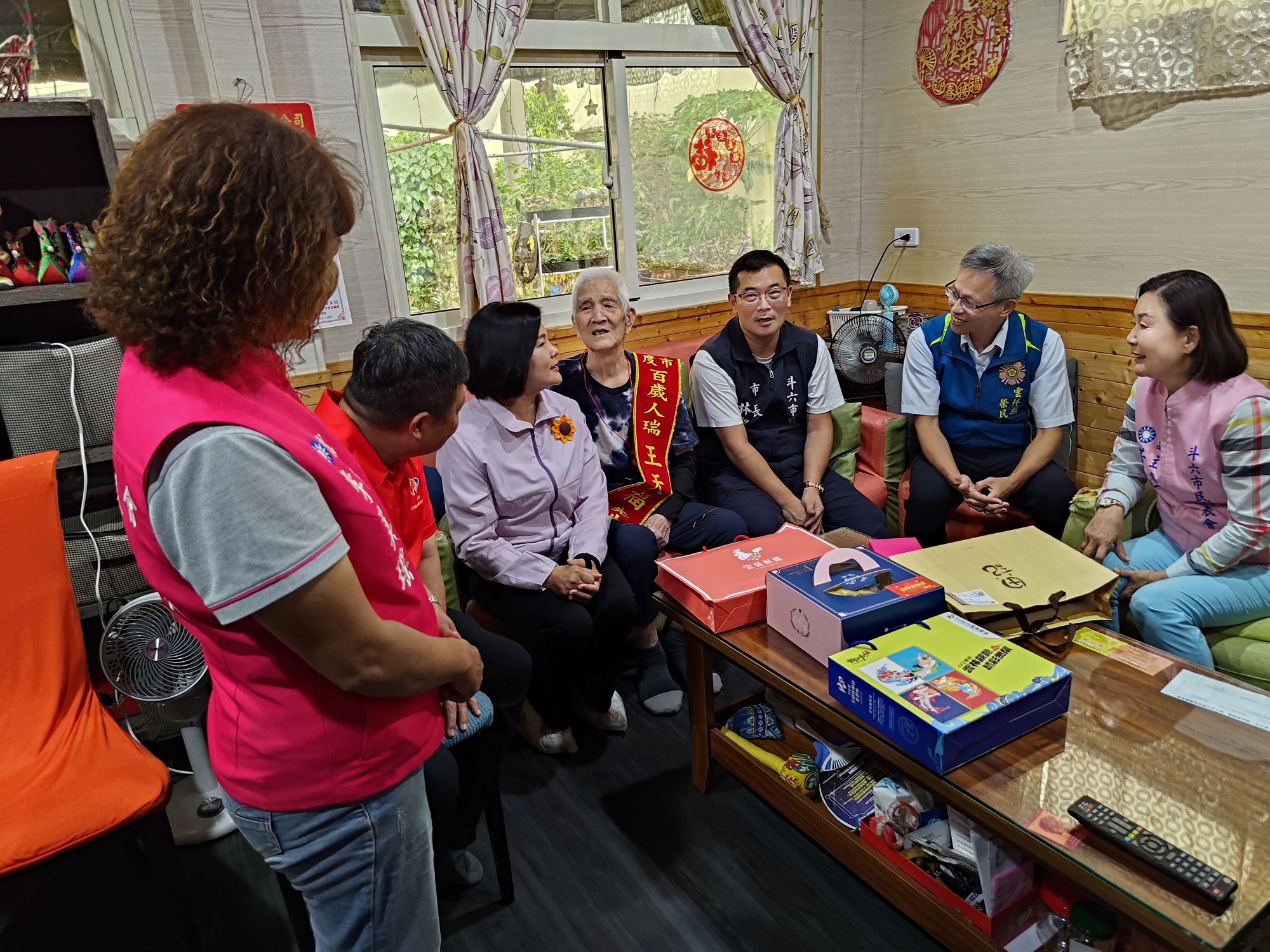圖2-蘇文玄處長(左1)和雲林縣張麗善縣長(左2)關懷百歲榮民謝發銀伯伯,祝賀重陽節快樂。
