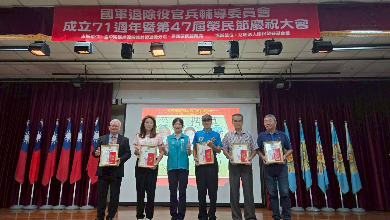 慶祝大會開始前播放嘉義榮民服務處與臺中榮總嘉義暨灣橋分院服務照顧榮民眷影片,讓與會人員深入瞭解榮服處與榮院服務照顧工作,活動中除感謝本次活動的協辦單位外,同時表揚榮民楷模湯宏忠、黃敏寧、郭芳溢、沈李豪及黃江山等5位榮民楷模;嘉友電子股份有限公司、月桃故事聲暨國際股份有限公司、雲朗觀光股份有限公司嘉義分公司及竣旭有限公司等4家績優廠商,財團法人嘉義市福添福社會福利基金會、欣嘉石油氣股份有限公司、欣雲天然氣股份有限公司、財團法人榮民榮眷基金會、榮民之友會、雪中送炭關懷協會及萬事達開發行銷有限公司等友好單位,感謝長期對榮服處辦理各項活動之支持,另頒發愛爾麗實業有限公司等10個單位公益楷模獎座,表揚公益楷模們「行善不求聞達,默默成就光榮」之精神,活動最後在與會人員揮舞國旗合唱中華民國頌,展現榮民精神與愛國情操中,溫馨結束。