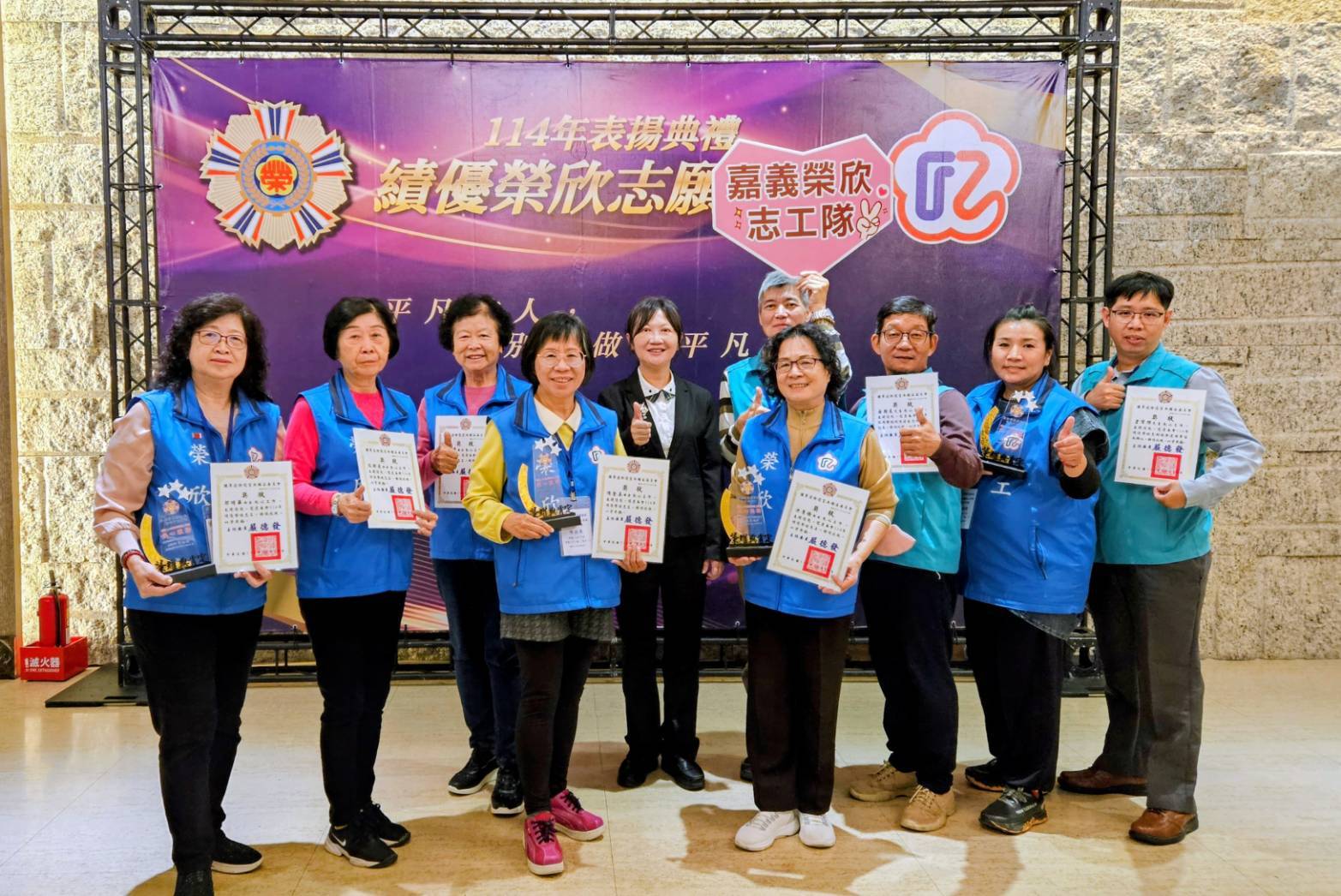 嘉義榮服處處長許淑菁今(4)日率榮欣志工團隊參加退輔會「114年績優榮欣志願服務表揚典禮」,榮服處志工服務表現深獲肯定, 獲頒多項殊榮,許處長感謝志工夥伴的無私奉獻及努力,彰顯志工服務成果。