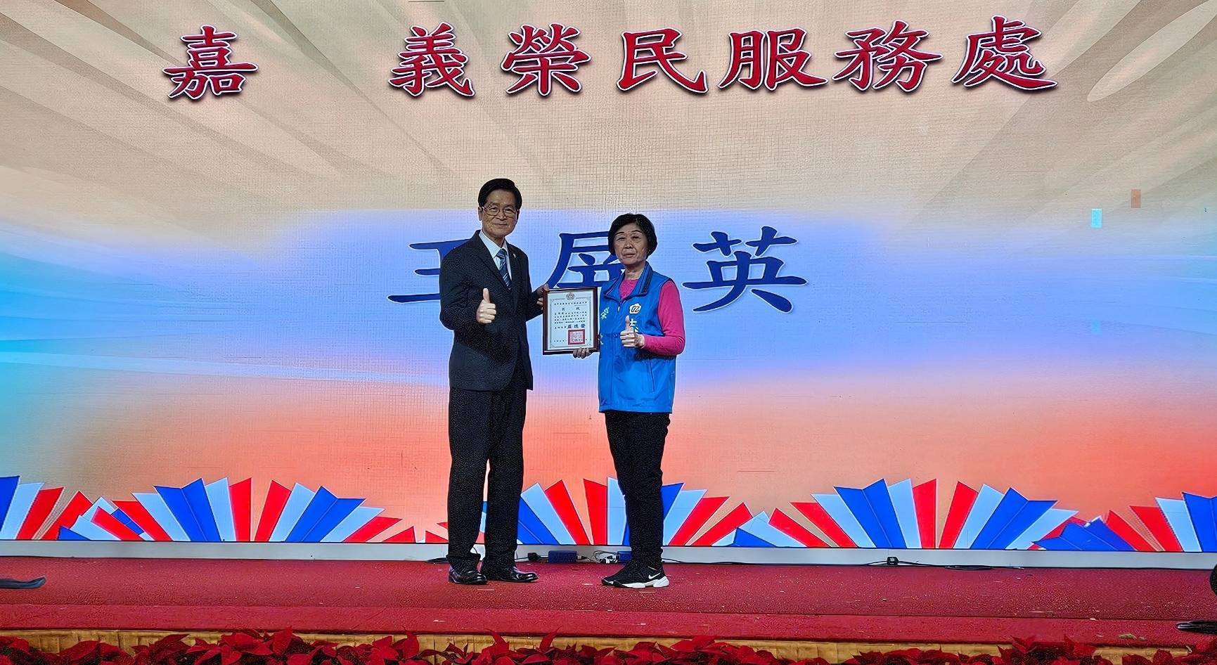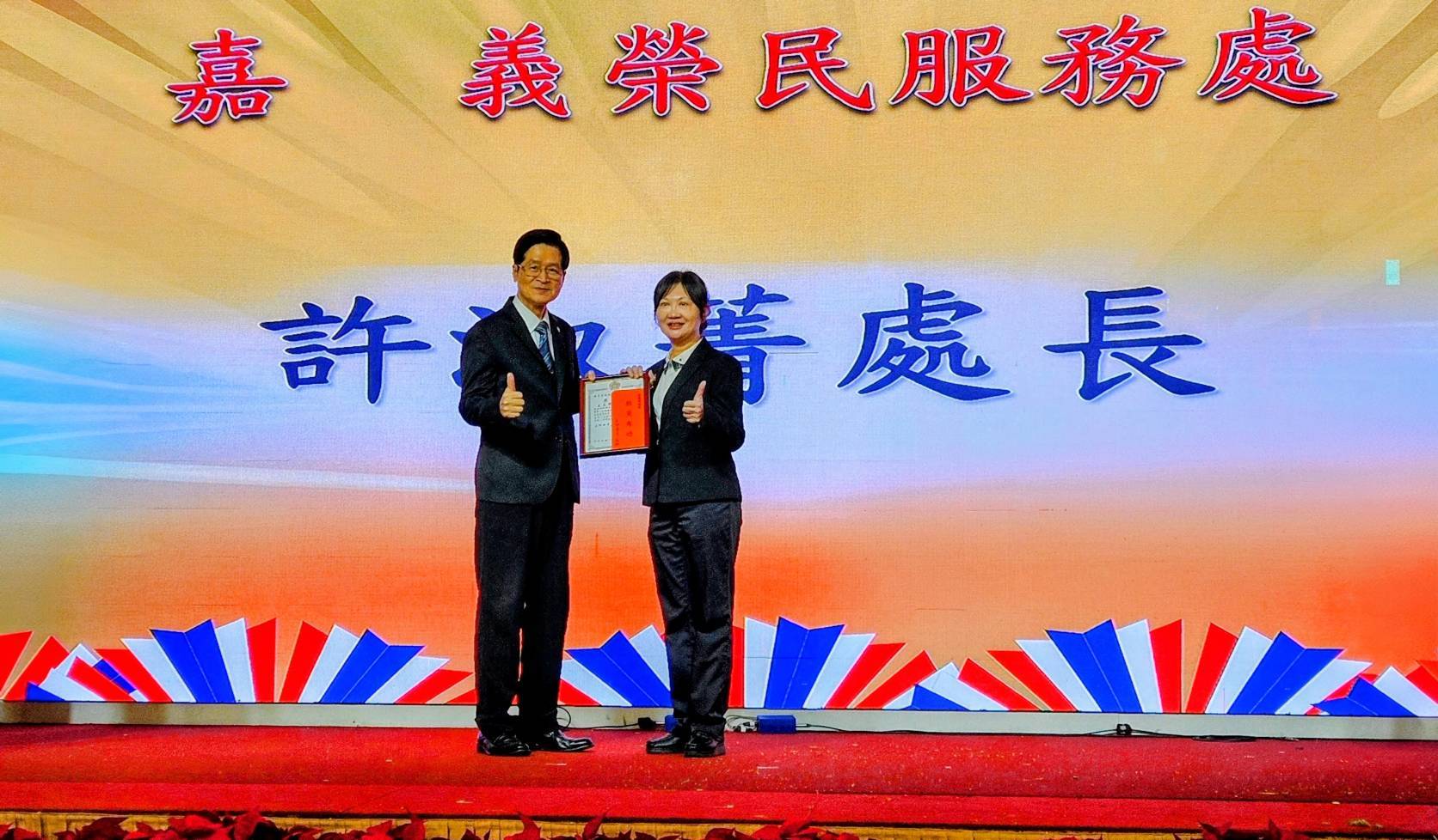 嘉義榮服處此次獲頒「績優志願服務運用單位」、「績優承辦人員」、「績優社區志願服務組長」、「資深榮欣志工」及「救災有功運用單位」等獎項。其中,「救災有功運用單位」格外受到矚目。7月丹娜斯颱風重創嘉義地區,許處長帶領同仁與志工災後深入災區訪視受災榮民眷,並協助白河、佳里等榮家災後重建,獲退輔會特別表揚,頒獎時全場熱烈歡呼,志工們亦感到無比榮耀。