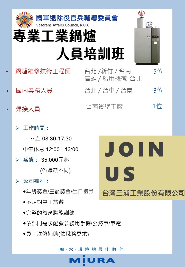 【輔導會產訓合作班隊-工業鍋爐專業人才培訓班(企業自訓)】 媒合企業:台灣三浦工業股份有限公司 職務工作內容說明: ※國內業務人員:工業蒸氣鍋爐的銷售與市場開發、定期拜訪客戶、開發潛在客戶、拓展新市場、負責業務接洽/訂單/合約處理、設備節能規劃提案、訂購接單到試車的完整服務、不定期國內出差 。 ※生產部-焊接人員:負責生產線機器、設備之操作及維持正常運作、進行產品組裝、電焊、CO2焊接等作業、協調其他作業員以符合生產及程序標準、填寫生產報表、完成主管交辦事項 。 招募學經歷及相關條件: 國內業務人員:專科(含)以上 ,具備 Excel & Word 基本文書處理能力 ,有銷售能力者佳 。 生產部-焊接人員:高中(含)以上 ,有焊接証照、經驗尤佳 。 工作地點 (主要據點):台北總公司、新竹分公司、台中分公司、台南分公司、高雄營業所、台南工廠、台北船用部 。 薪資: 福利: 以上資訊若有興趣,請洽本處索取履歷表填寫回傳。