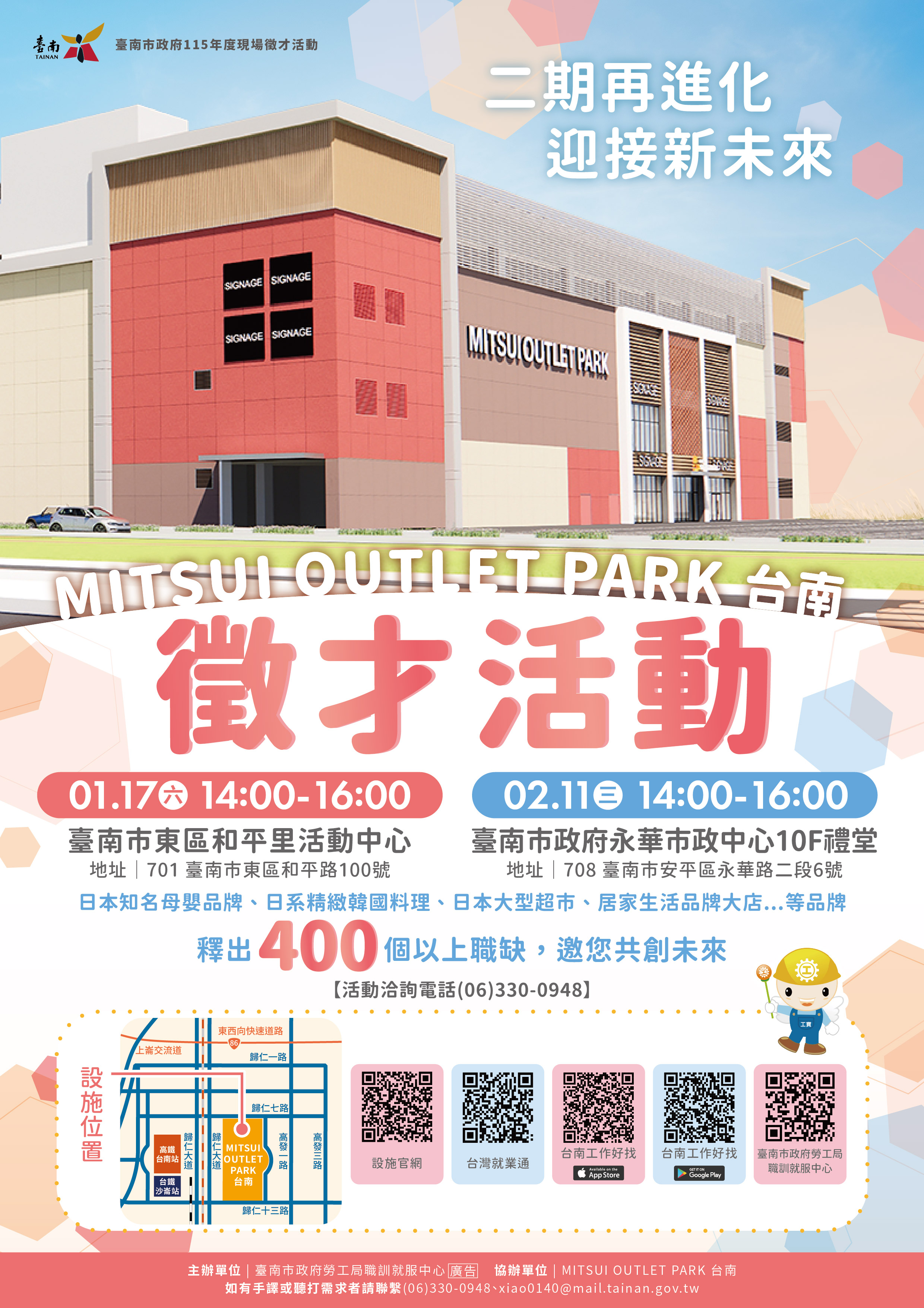 台南三井MITSUIOUTLET PARK二期現場徵才活動,分別於1月17日(週六)下午2時至4時在東區和平里活動中心、2月11日(週三) 下午2時至4時在永華市政中心10樓禮堂辦理,當日提供逾400個工作機會,活動當天有「投履歷送好康」,詳洽:06-3300948。
