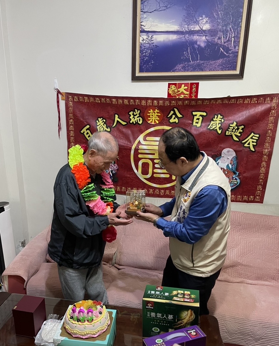 百歲人瑞難得一見,而走過戰火歲月的葉起榮民,更以堅韌生命力寫下動人的世代記憶。臺南市榮民服務處處長王國能於是(22)日率領責任區輔導員、榮欣志工與替代役弟兄前往探視,於葉爺爺府上舉辦溫馨而隆重的百歲慶生活動。王處長除敬獻總統與行政院院長賀壽壽屏外,並代輔導會主任委員致贈琉璃壽桃金飾,象徵國家對其戎馬歲月的誠摯敬意。