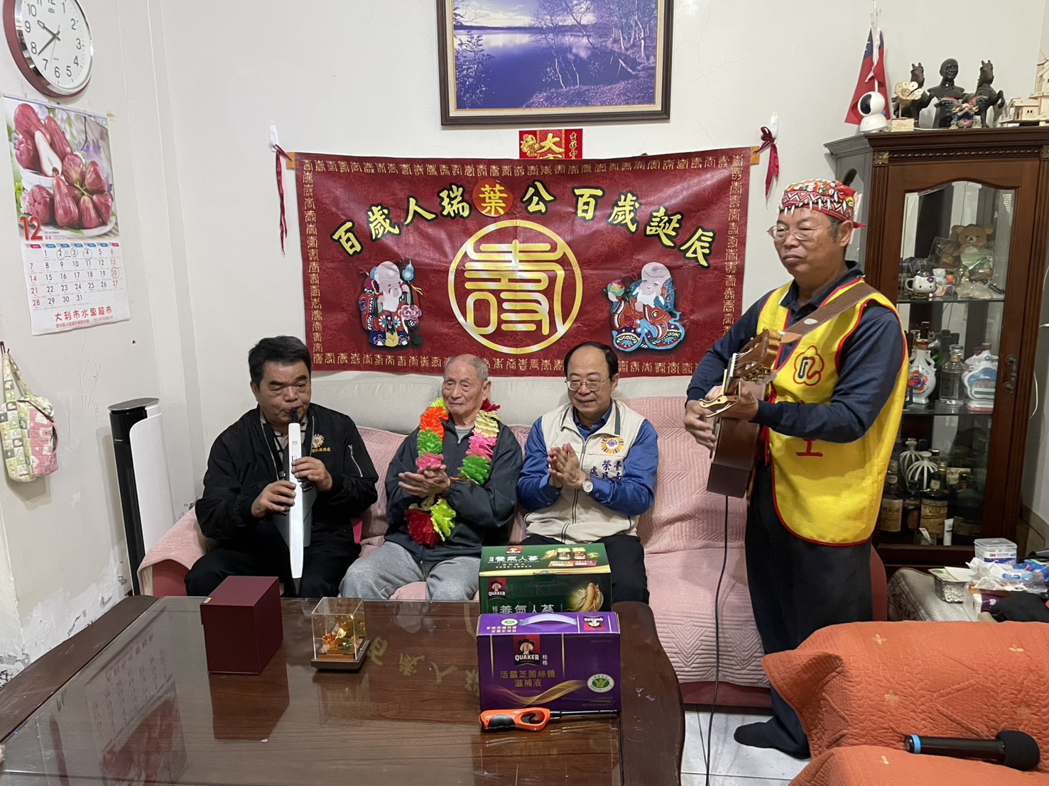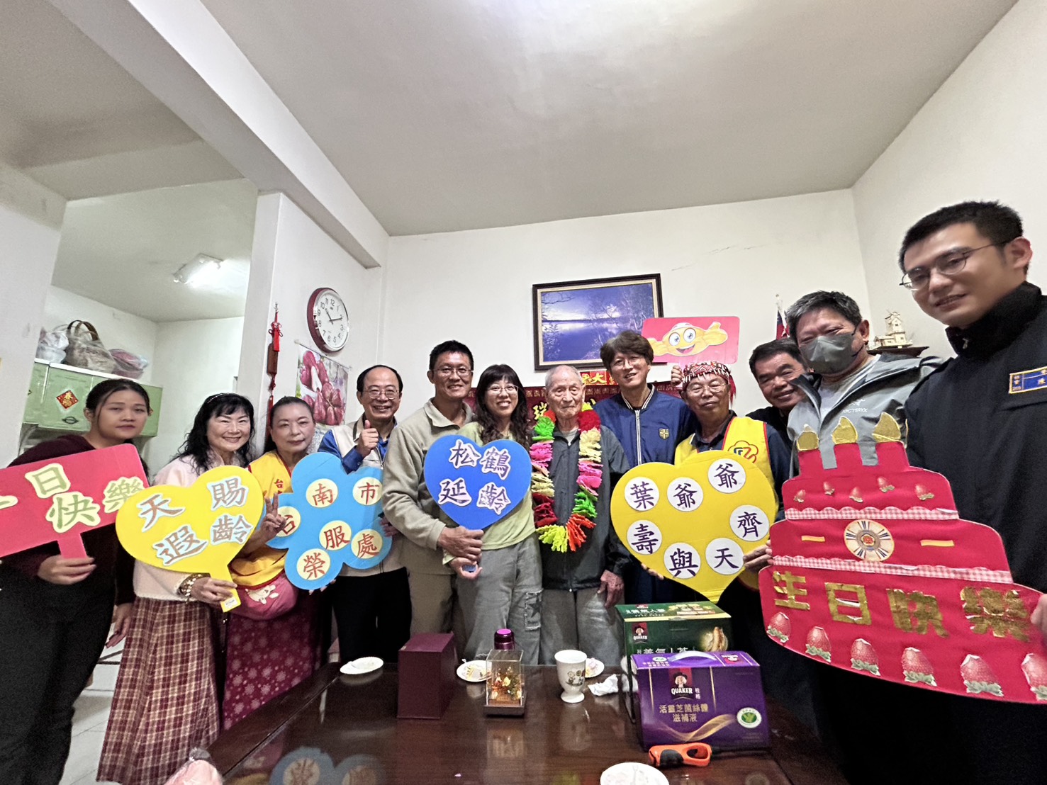 為使慶生更添溫度,榮服處特邀榮欣志工蔡長富以口琴與中國笛演奏,並由處內音樂同好以電子琴、薩克斯風等樂器伴奏,為壽星獻上溫婉樂音。現場合唱〈生日快樂〉,並接續演奏《夜來香》《甜蜜蜜》《祝你幸福》等經典曲目,旋律悠揚,暖意盈室。王處長與到場來賓逐一獻上祝福,葉爺爺笑容滿面,感動直言:「家裡好久沒這麼熱鬧了!」並許下健康長壽、呷百二的美好心願。