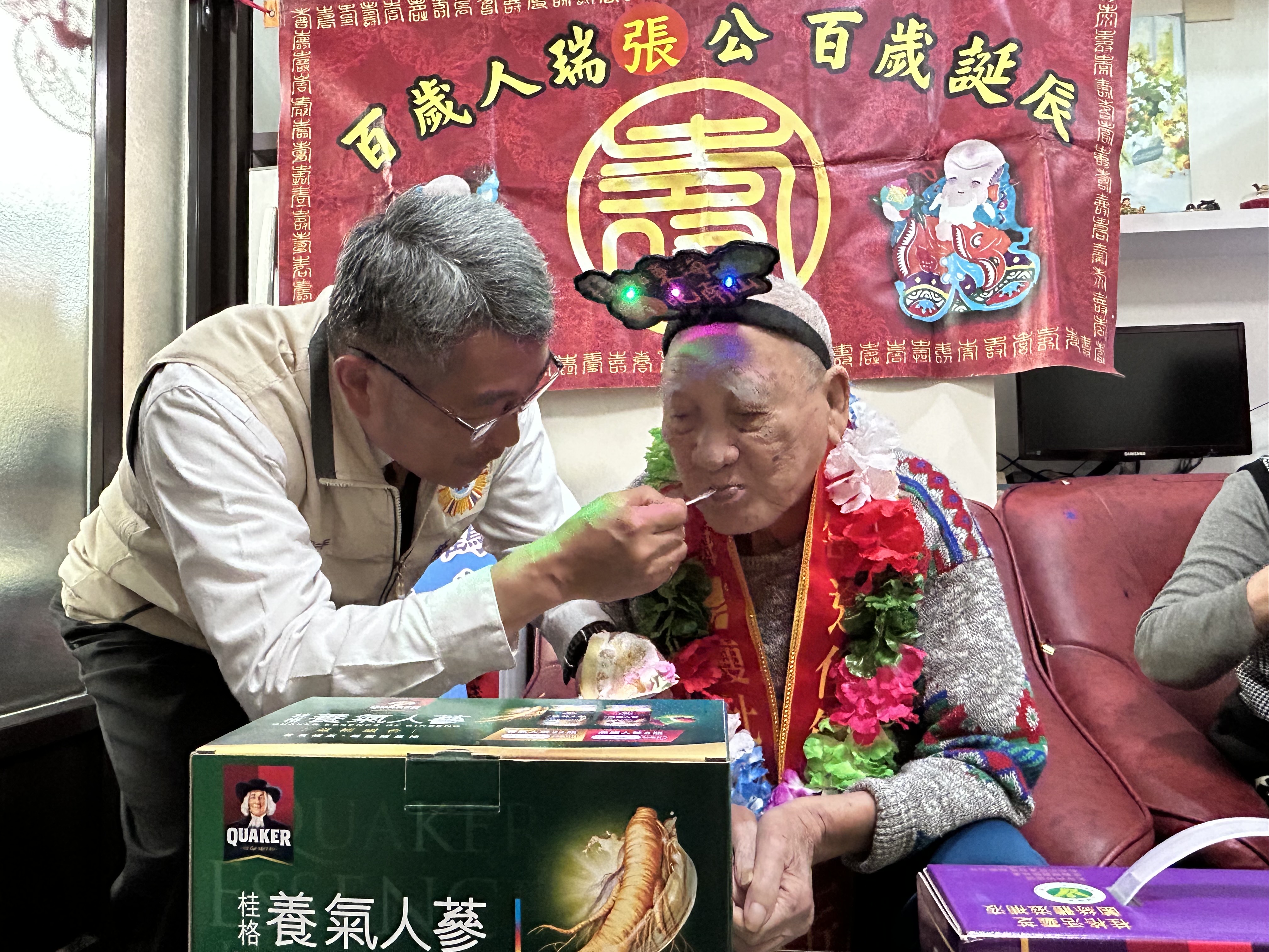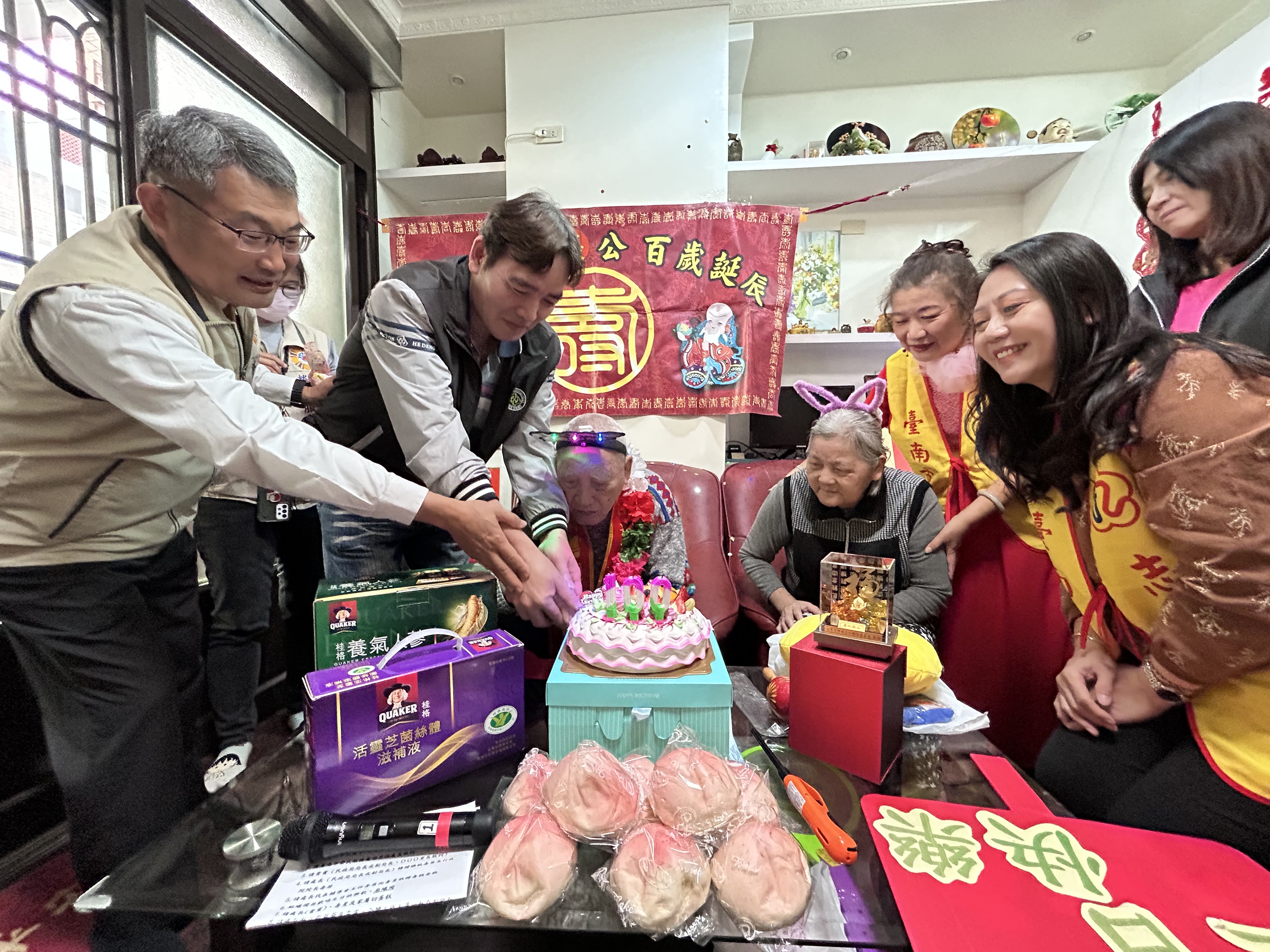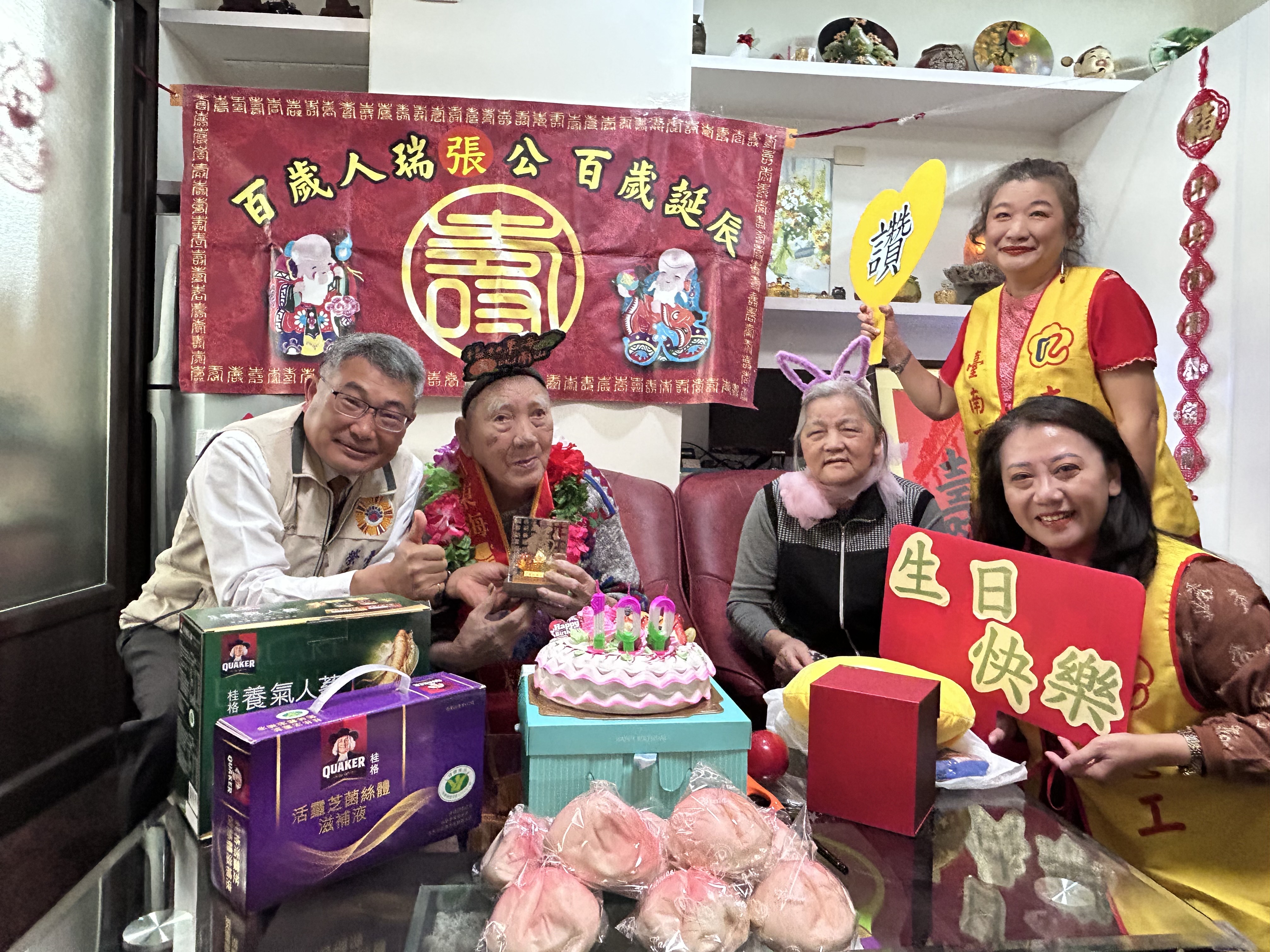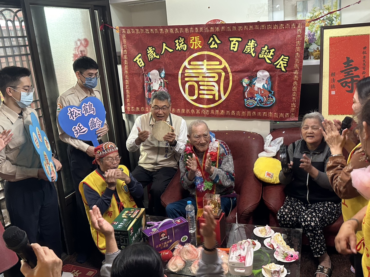 榮民張世柱爺爺喜迎百歲嵩壽,臺南市榮服處處長胡思湘於今(17)日鏈結華山基金會永康2站黃沛鈞站長,親率責任區輔導員、榮欣志工及替代役男等同仁,並邀請復華里里長王松俊等仕紳,前往張府舉辦百歲賀壽活動。胡處長代表致贈總統及行政院院長祝賀壽屏,並轉送輔導會主任委員獻上象徵福壽綿延的琉璃壽桃金飾;王里長現場表達誠摯祝賀,共同祝福張爺爺壽福康寧、至德延年,展現國家對榮民戎馬一生、奉獻家國的崇高敬意。