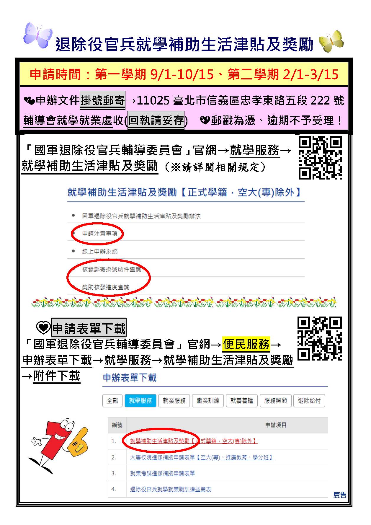 114學年度第2學期退除役官兵就學補助、生活津貼及成績優異獎勵,自2月1日起至3月15日受理申請,以掛號郵戳為憑,逾期不予受理,敬請詳閱申請注意事項,瞭解申辦限制規定;合於就業(含職訓)、就養、就學之規定者,在同一時期以申請輔導安置一項為限。 💗申辦表單下載 https://www.vac.gov.tw/cp-1797-3239-1.html 💚申請注意事項https://www.vac.gov.tw/cp-2215-69162-1.html 💜申請方式:請於截止期限前填妥申請表、備齊相關文件,掛號郵寄「國軍退除役官兵輔導委員會就學就業處」(11025臺北市信義區忠孝東路五段222號) 💖表單索取洽詢專線:07-2513881 💖貼心叮嚀:同時具有不同就學補助、減免資格身分者,先行試算並比較各項學雜費減免、補助額度;如欲申請本會就學補助者,需先洽就讀學校申請繳納全額學費(先繳回已抵減之款項)後,再向本會提出申請。 附件:就學補助生活津貼及獎勵申辦宣導DM、申請表單 附件下載