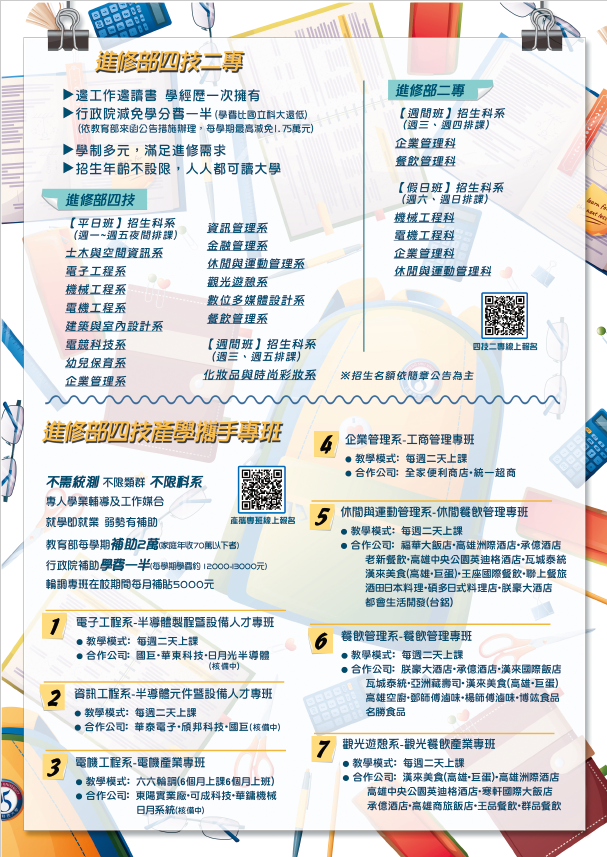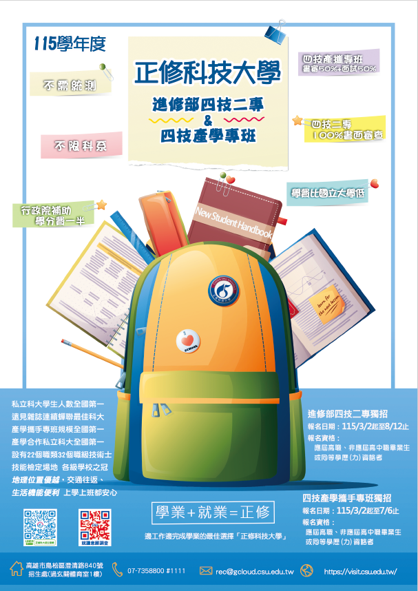 正修科技大學115年學度「產學攜手專班」即日起開始招生,共有7個進修部產學班,可依自身意願報名就讀。