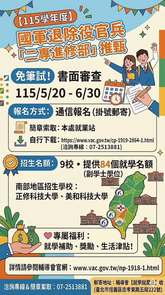 115學年度退除役官兵就讀大專校院二專進修部甄選推薦入學,計有國立臺中科技大學等9校,提供84個就學名額,畢業後即可取得副學士學位。南部地區招生學校有正修及美和等科技大學,敬請把握機會踴躍報名! 報名日期:115年5月20日至6月30日止,請洽本處就業站索取報名簡章或自行下載。(洽詢專線:07-2513881) 報名方式:通信報名(採書面審查),於報名截止日前備妥相關資料,掛號郵寄至輔導會【就學就業處】收(臺北市信義區忠孝東路五段222號)。