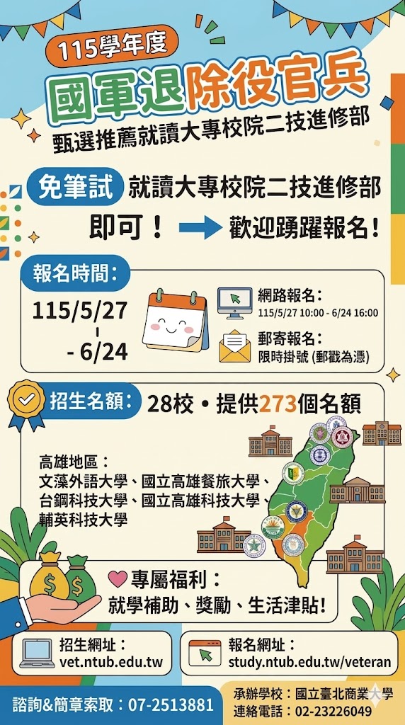 115學年度國軍退除役官兵就讀大學暨技術校院二年制進修部甄試,自115年5月27日至6月24日受理報名,計有國立臺北商業大學等28校,提供273個升學名額,本招生考試採「書面資料審查」,具專科或同等學歷之退除役官兵均可報名。 高雄地區招生學校計有文藻外語大學、國立高雄餐旅大學、台鋼科技大學、國立高雄科技大學、輔英科技大學等校,敬請把握機會踴躍報名! ★報名方式: 1.網路報名:115年5月27日10:00至6月24日 16:00止 2.郵寄報名:115年5月27日至6月24日 限時掛號(郵戳為憑) ★招生網址:https://vet.ntub.edu.tw ★報名網址:https://study.ntub.edu.tw/veteran ☆承辦學校:國立臺北商業大學 連絡電話:02-23226049、6044、6048