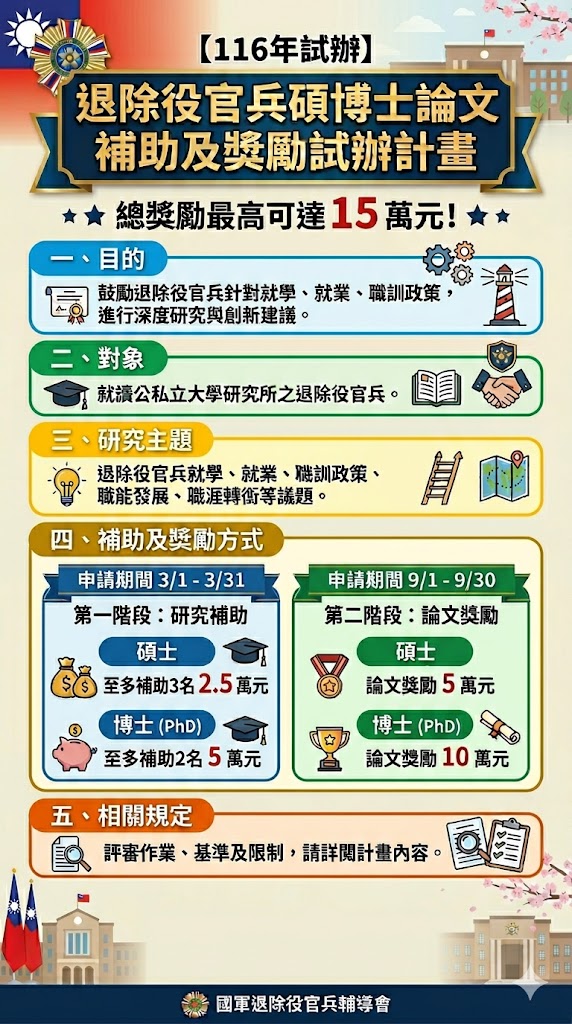 退除役官兵碩博士論文補助及獎勵試辦計畫,預定116年試辦