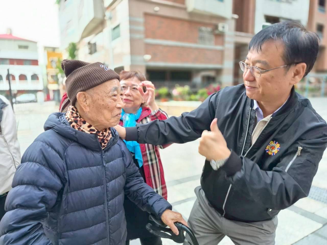 典禮結束後,劉處長率領榮服處同仁前往社區進行寒冬送暖訪視。本次訪視對象皆為近百歲的第一代榮民前輩,致贈保暖襪、圍巾、毛帽、祈福平安米、冬令進補食品及麥片等物資,傳遞保暖禦寒、營養補給與祈福平安的關懷心意,祝福長輩們新年快樂、身體健康、平安過冬。